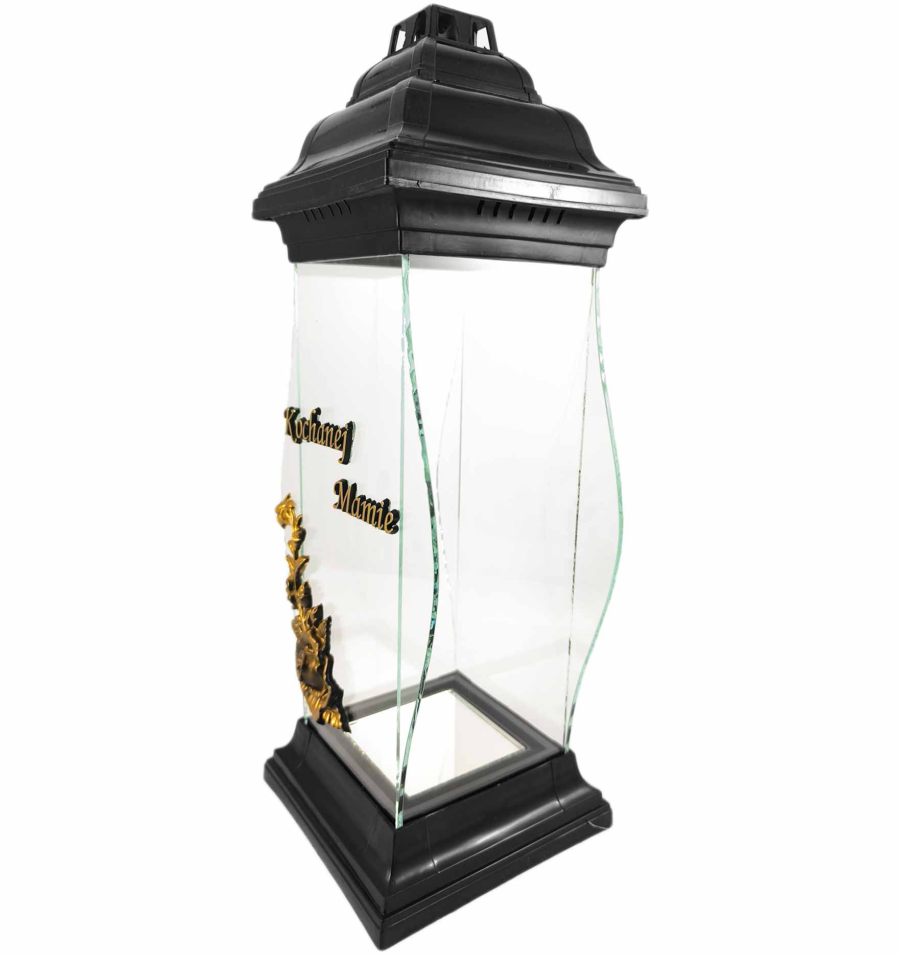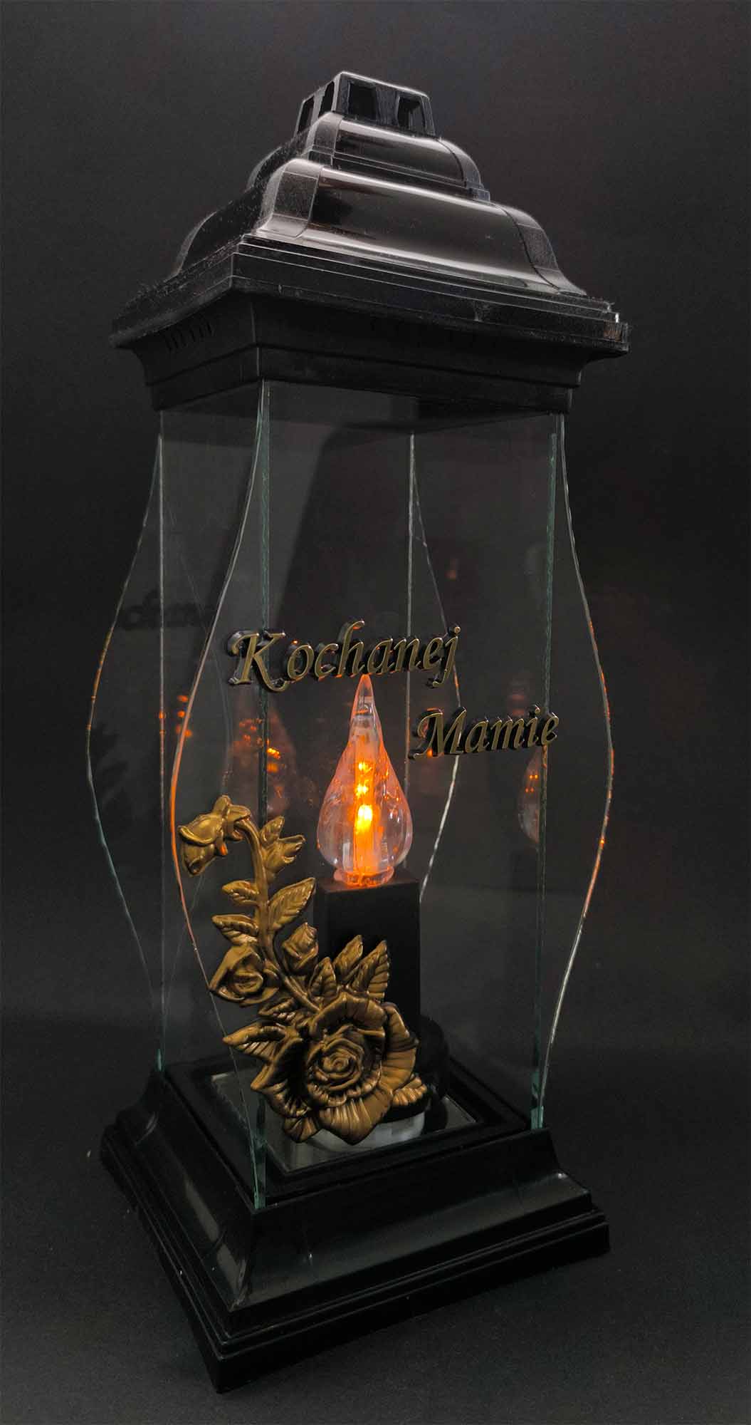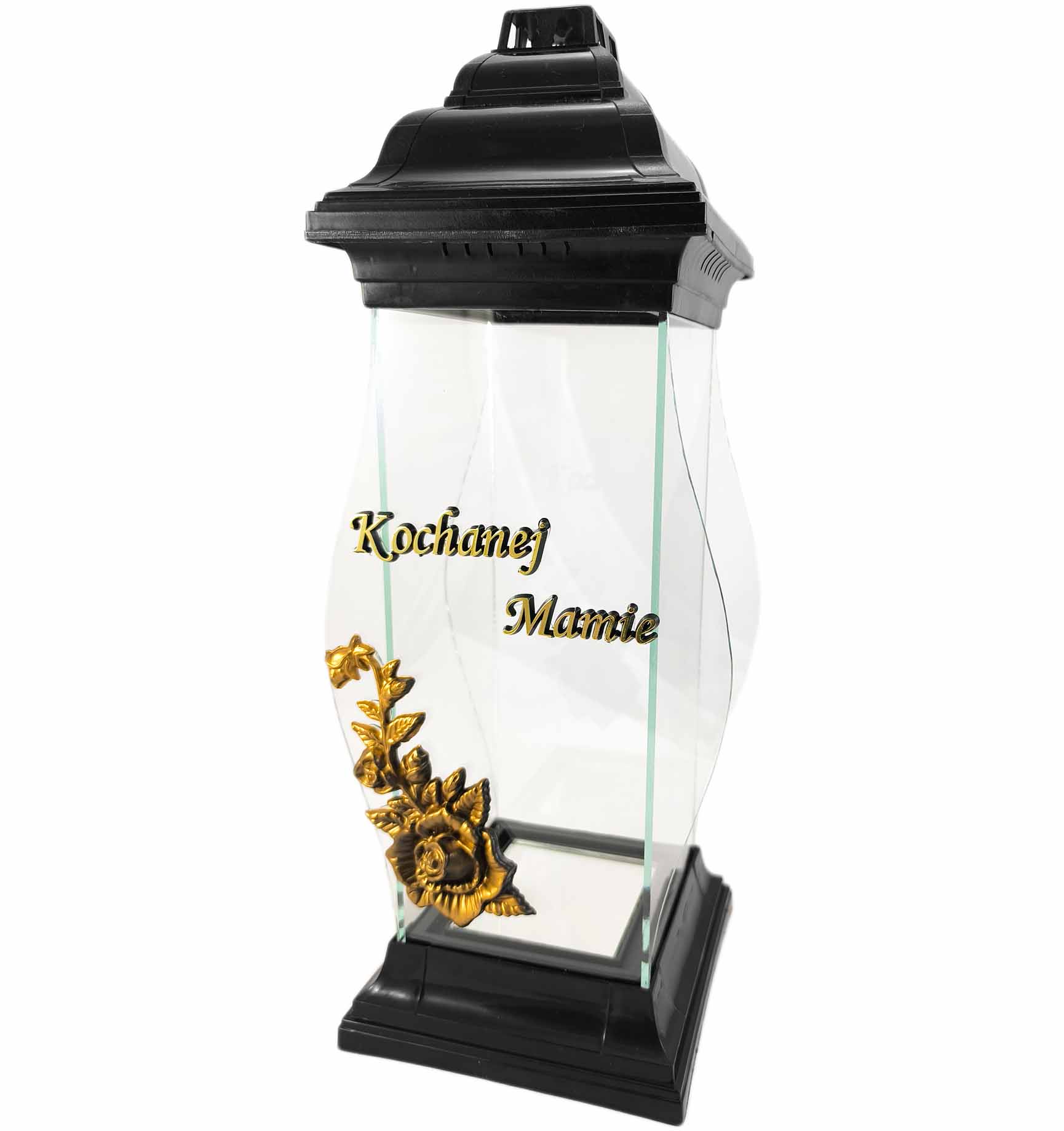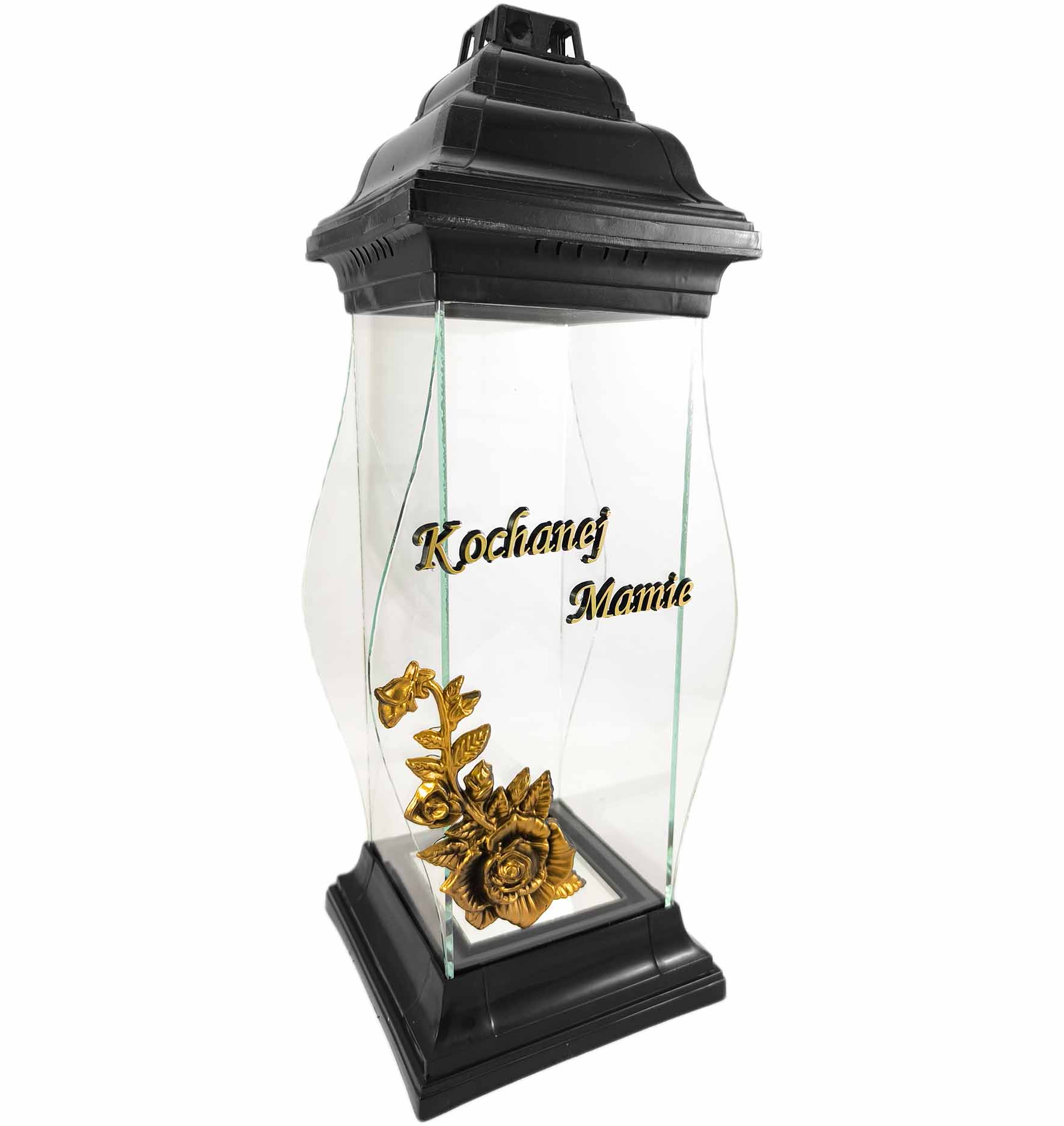 Pięknie wykonany znicz z bezbarwnego grubego szkła ze złotym napisem Kochanej Mamie. Znicz jest ciężki, solidny, a szeroka podstawa zapewnia stabilność. Elementy plastikowe wykonane są z twardego plastiku odpornego na wysokie temperatury.