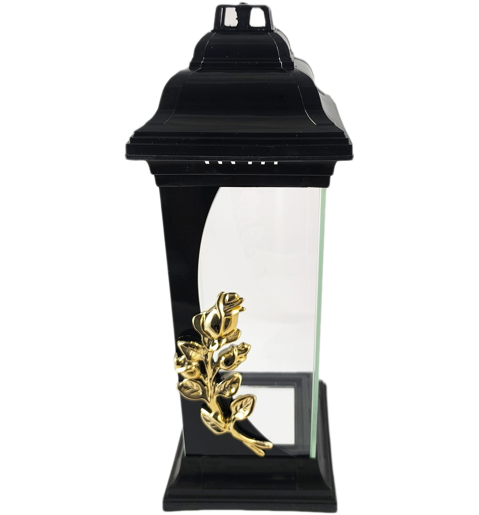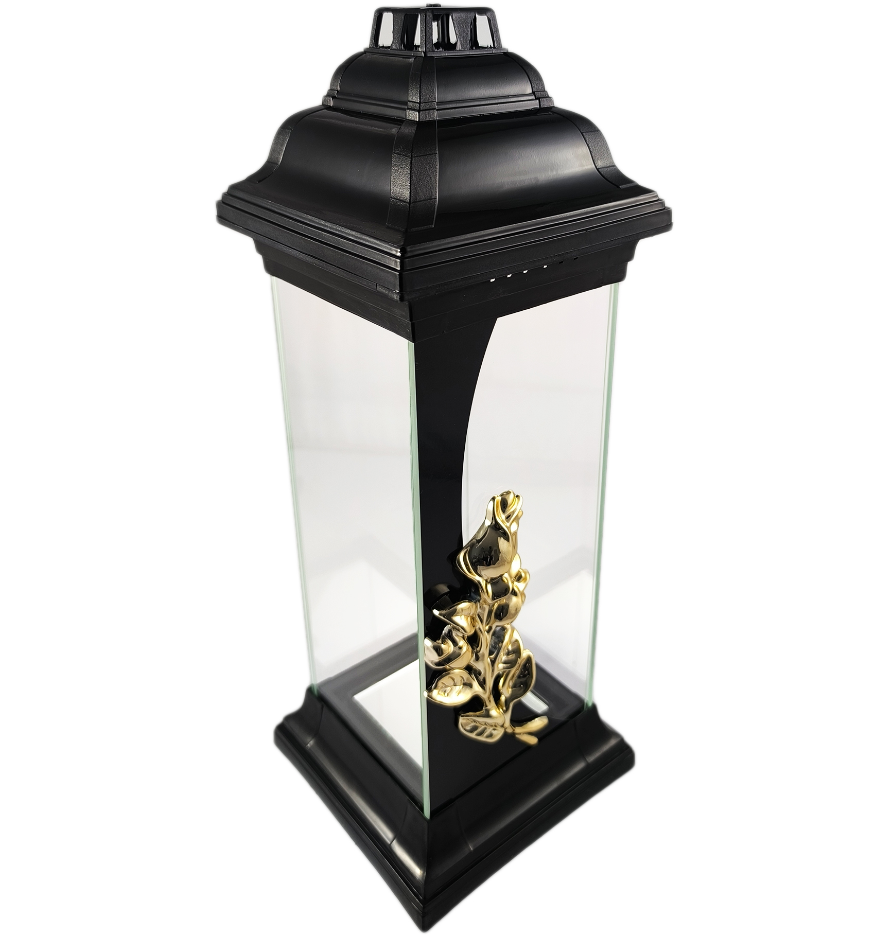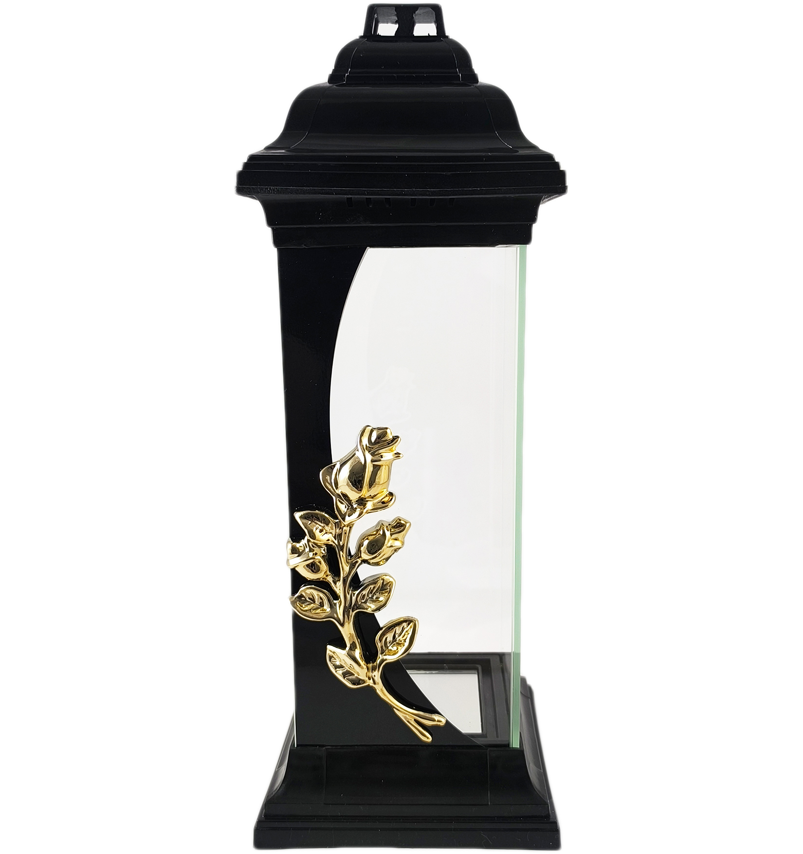 Kapliczka z różą wykonana z grubego i bezbarwnego szkła. Znicz jest ciężki, solidny, a szeroka podstawa zapewnia stabilność. Elementy plastikowe wykonane są z twardego plastiku odpornego na wysokie temperatury. Jedną ze szklanych ścianek zdobi pionowy, czarny pas, na którym umieszczono misternie wykonaną aplikację przedstawiającą złotą różę.