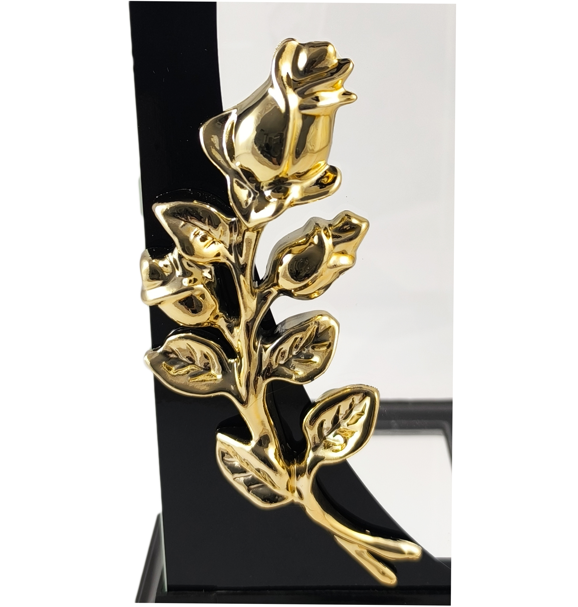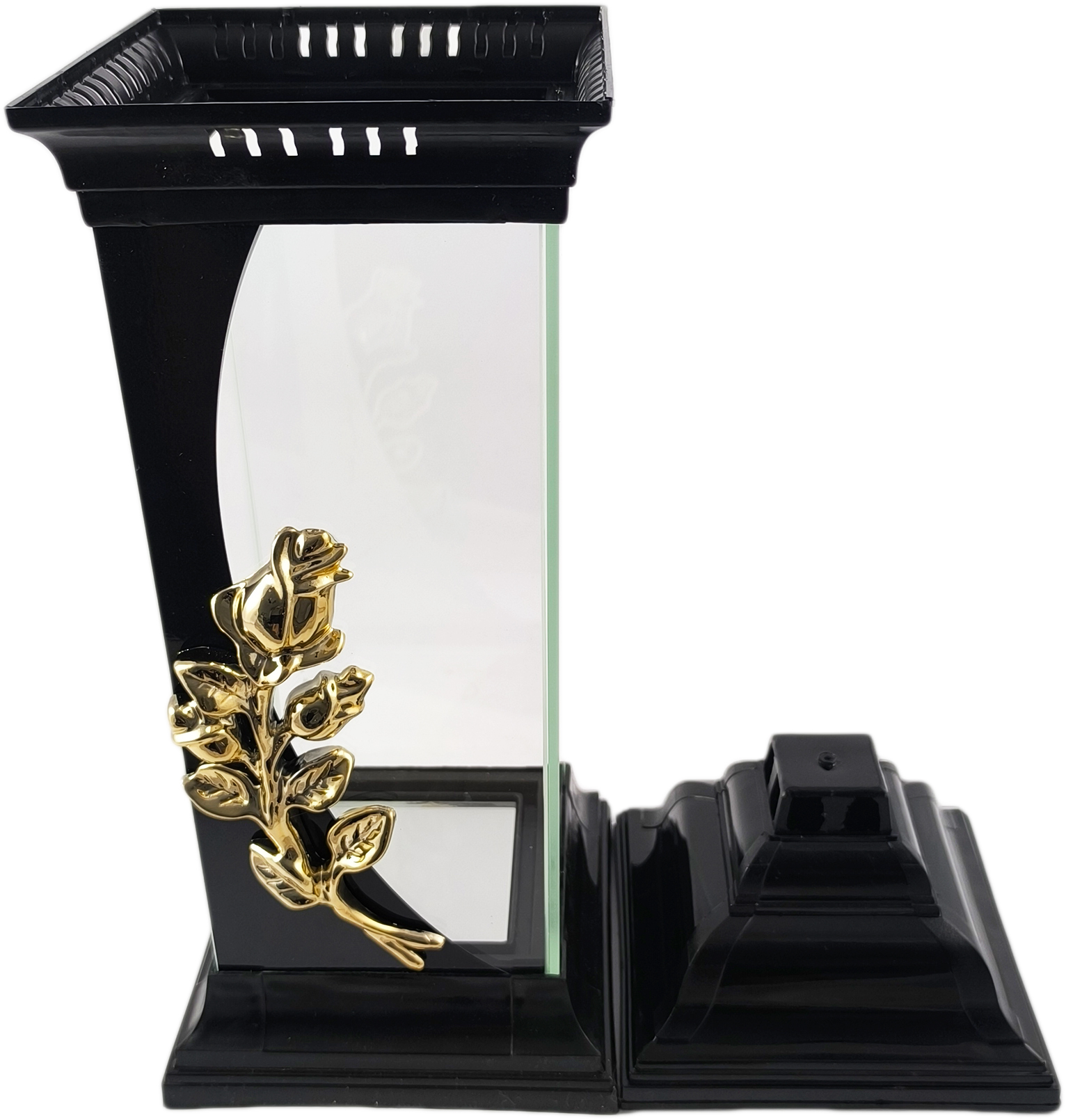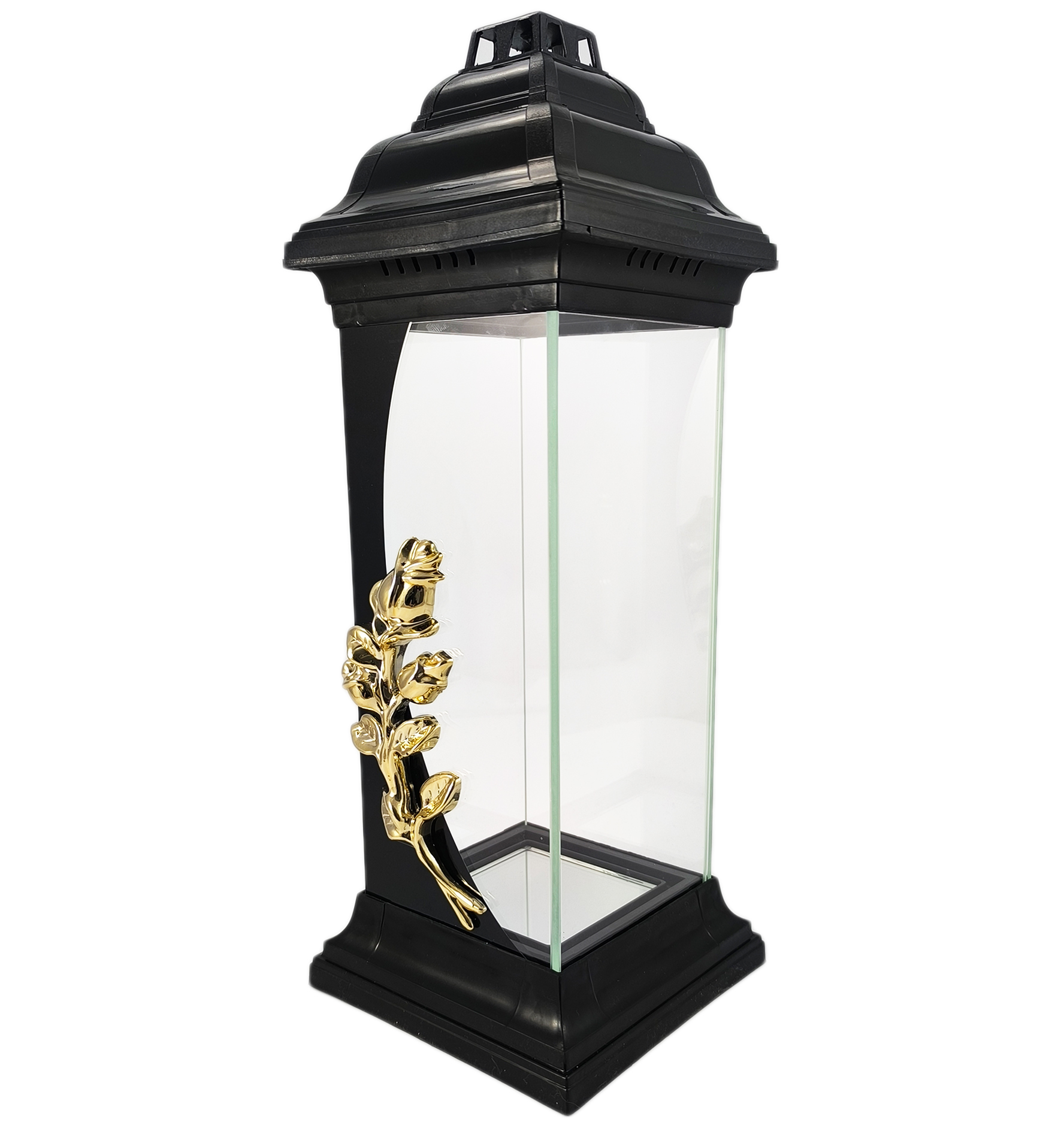 Kapliczka z różą wykonana z grubego i bezbarwnego szkła. Znicz jest ciężki, solidny, a szeroka podstawa zapewnia stabilność. Elementy plastikowe wykonane są z twardego plastiku odpornego na wysokie temperatury. Jedną ze szklanych ścianek zdobi pionowy, czarny pas, na którym umieszczono misternie wykonaną aplikację przedstawiającą złotą różę.