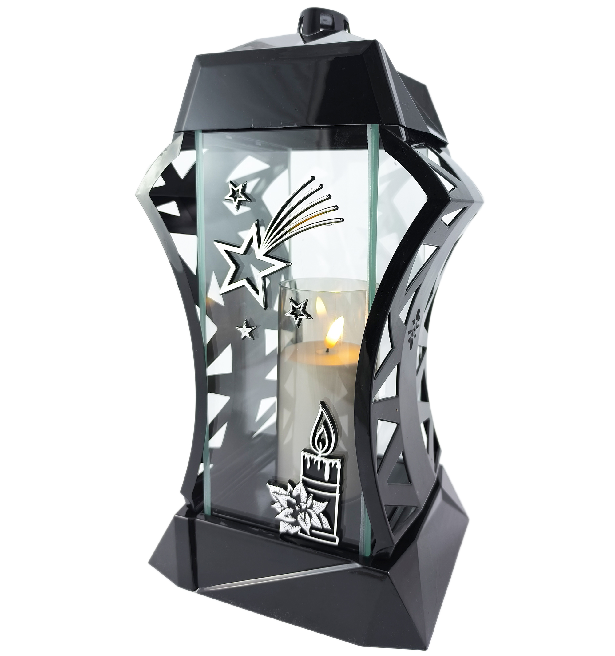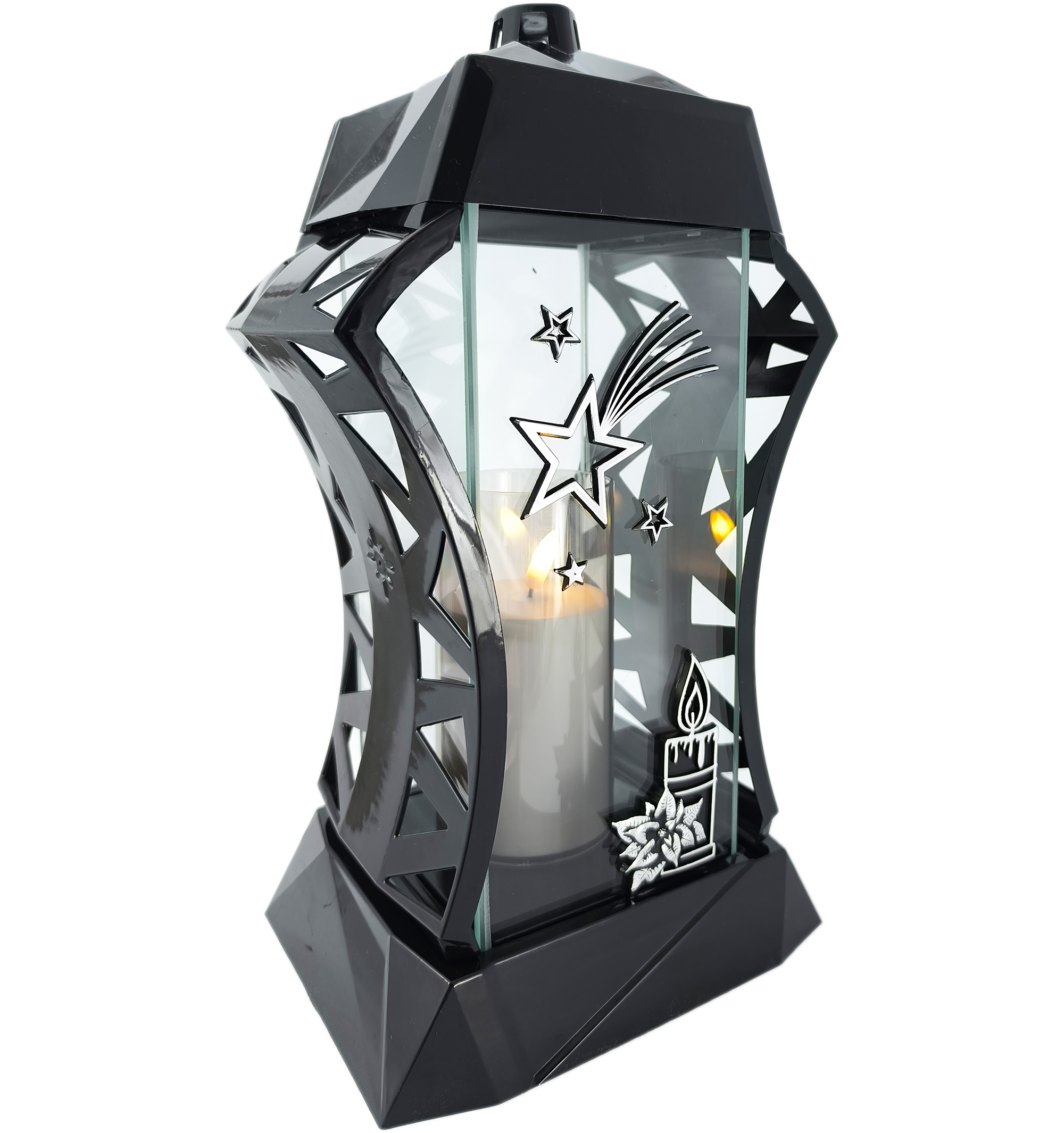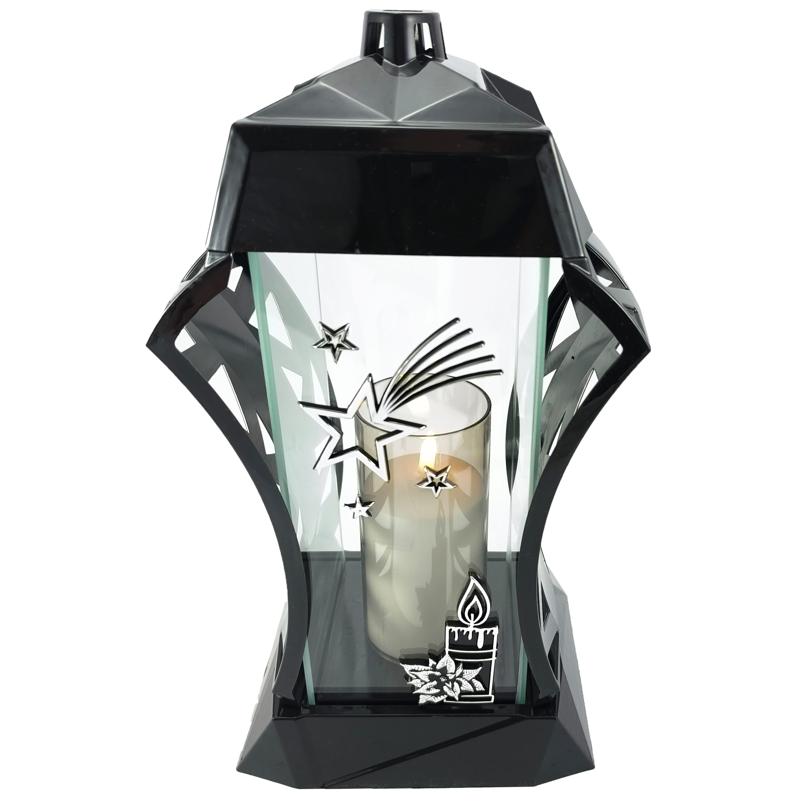 Znicz wykonano z wysokiej jakości tworzywa sztucznego w głębokiej czerni, którą przełamuje eleganckie srebrne zdobienie. Przednią ściankę z grubego szkła zdobi duża, przestrzenna, srebrna gwiazda oraz motyw świecy, które subtelnie podkreślają bożonarodzeniowy charakter lampionu.