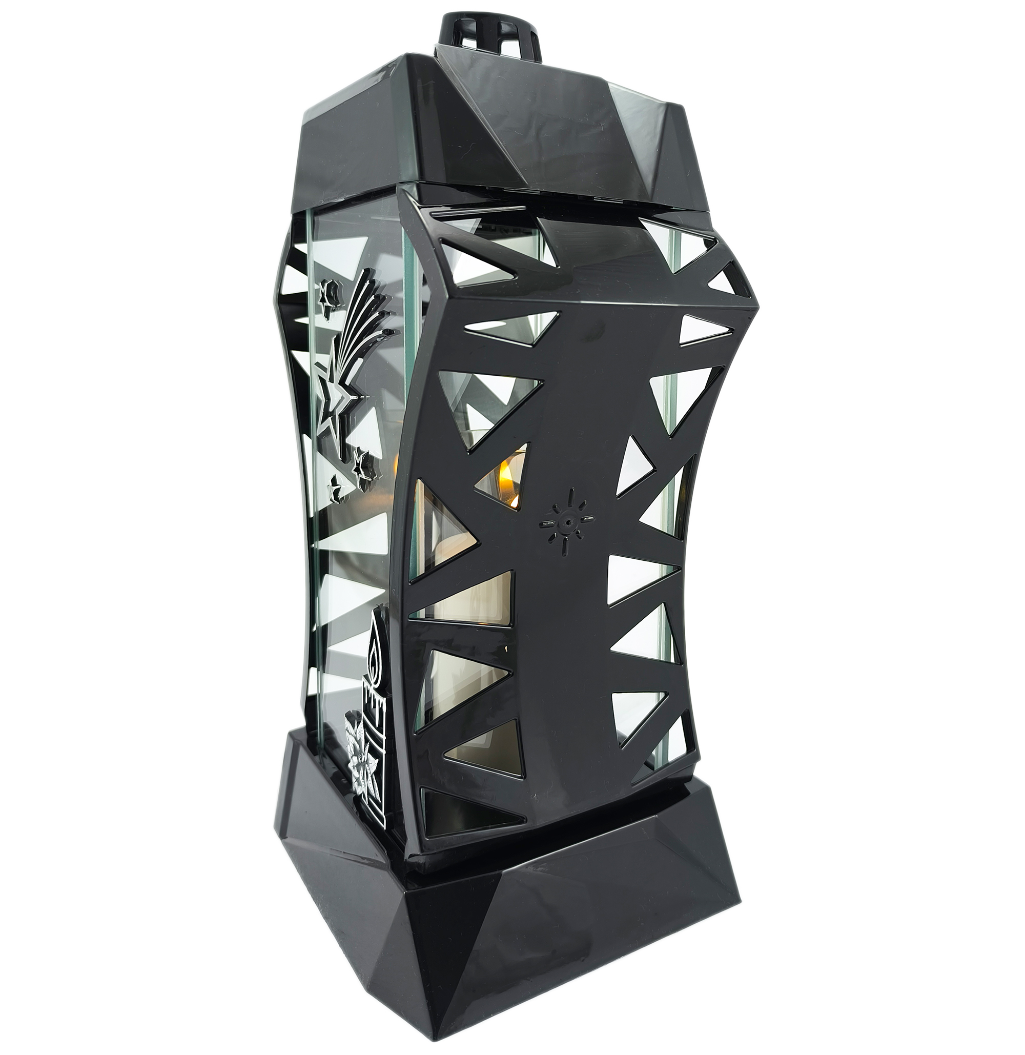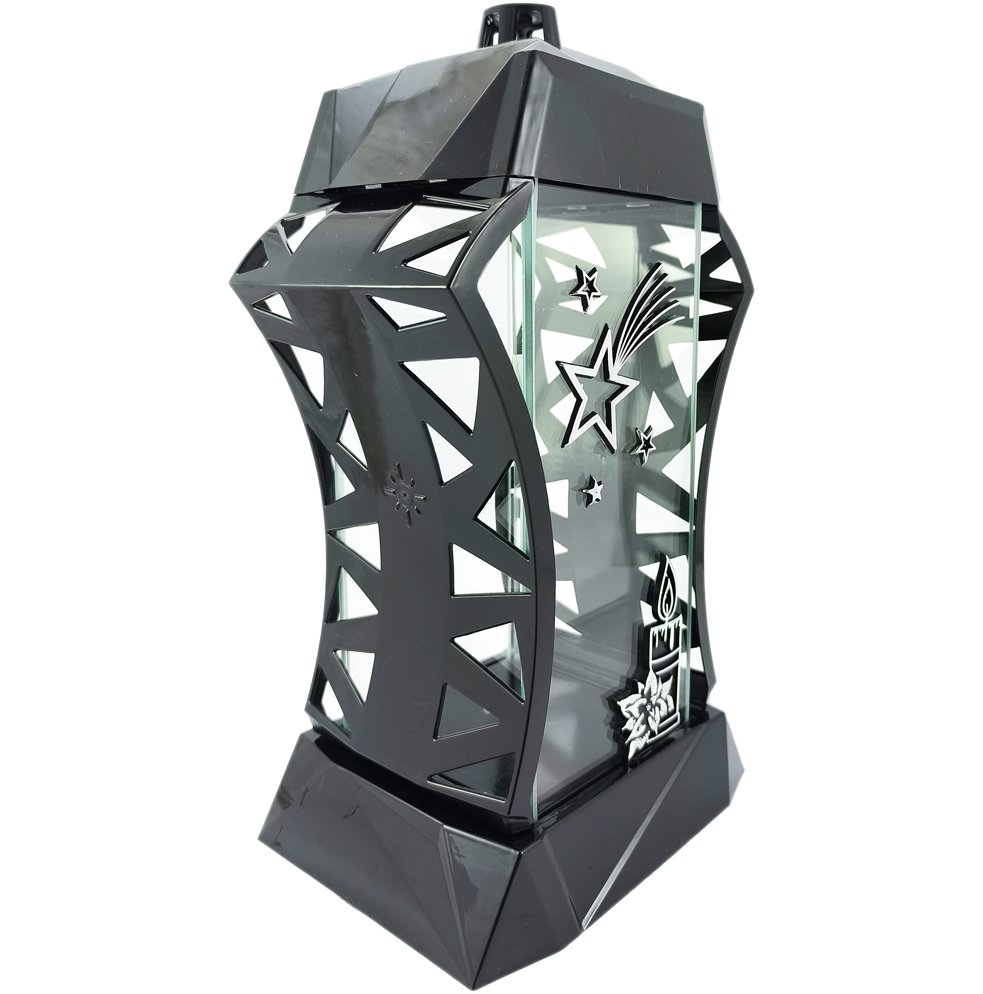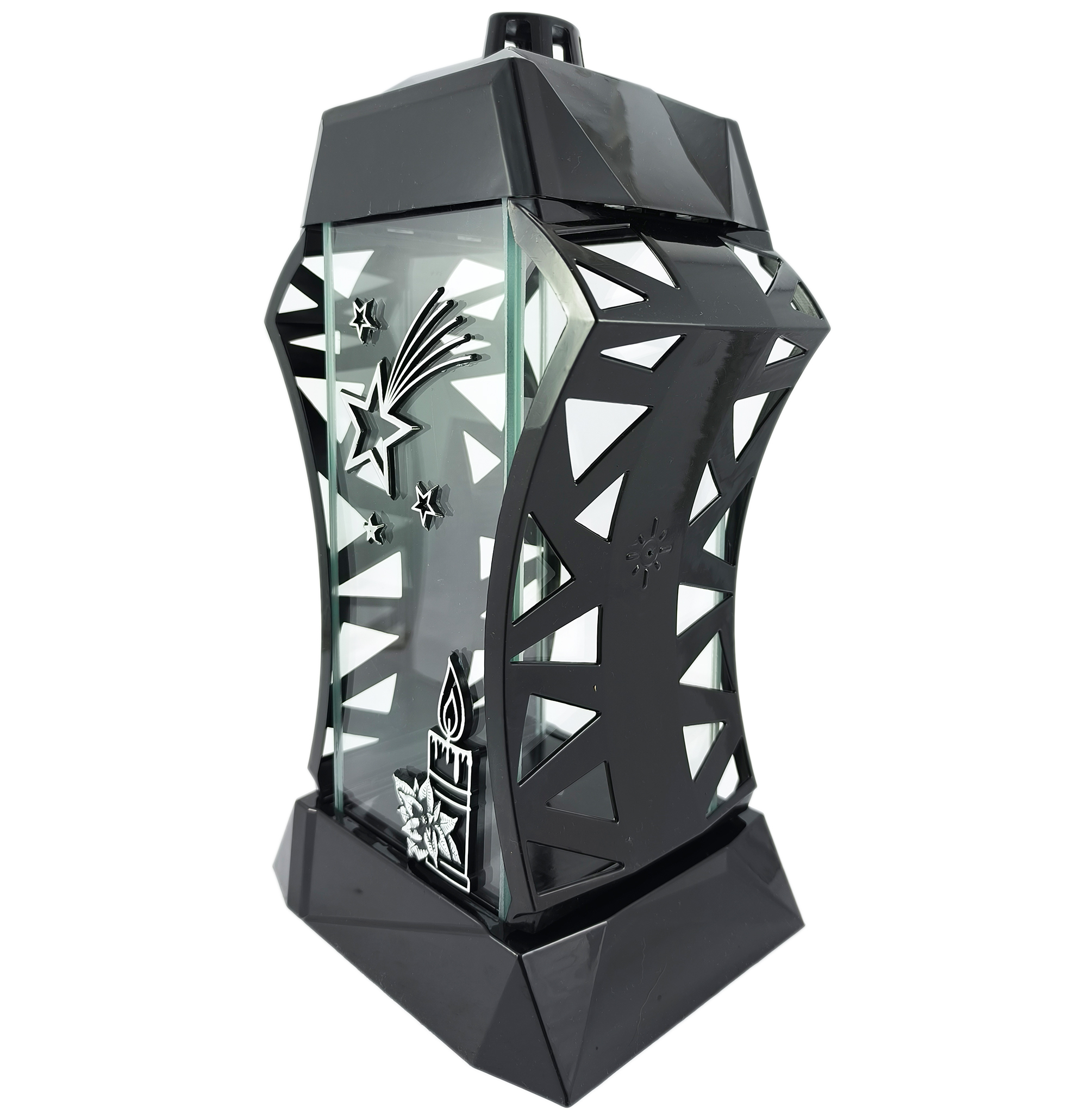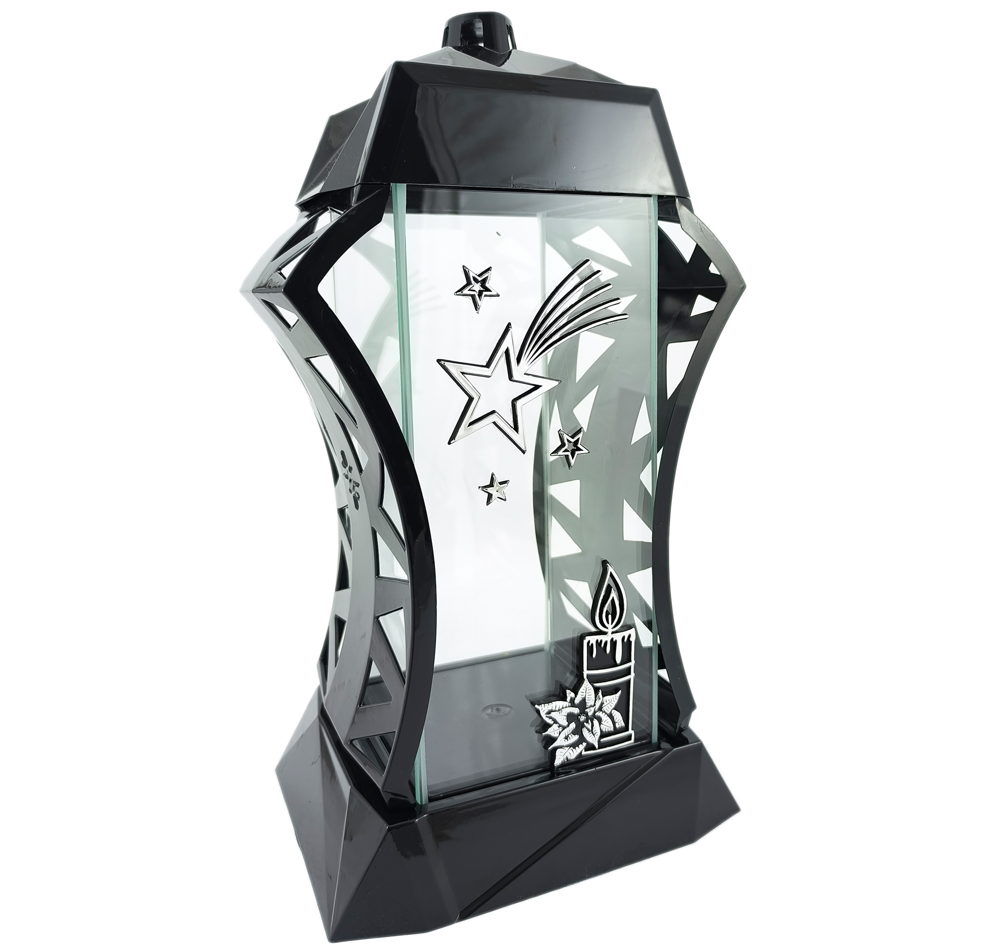 Znicz wykonano z wysokiej jakości tworzywa sztucznego w głębokiej czerni, którą przełamuje eleganckie srebrne zdobienie. Przednią ściankę z grubego szkła zdobi duża, przestrzenna, srebrna gwiazda oraz motyw świecy, które subtelnie podkreślają bożonarodzeniowy charakter lampionu.