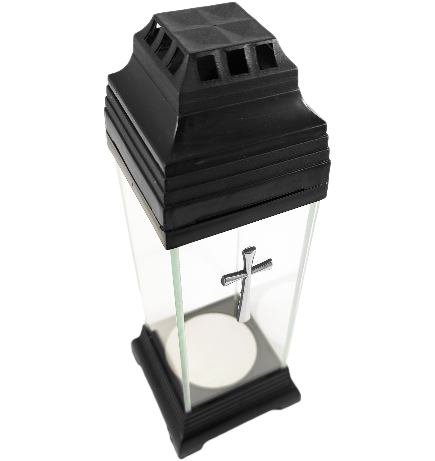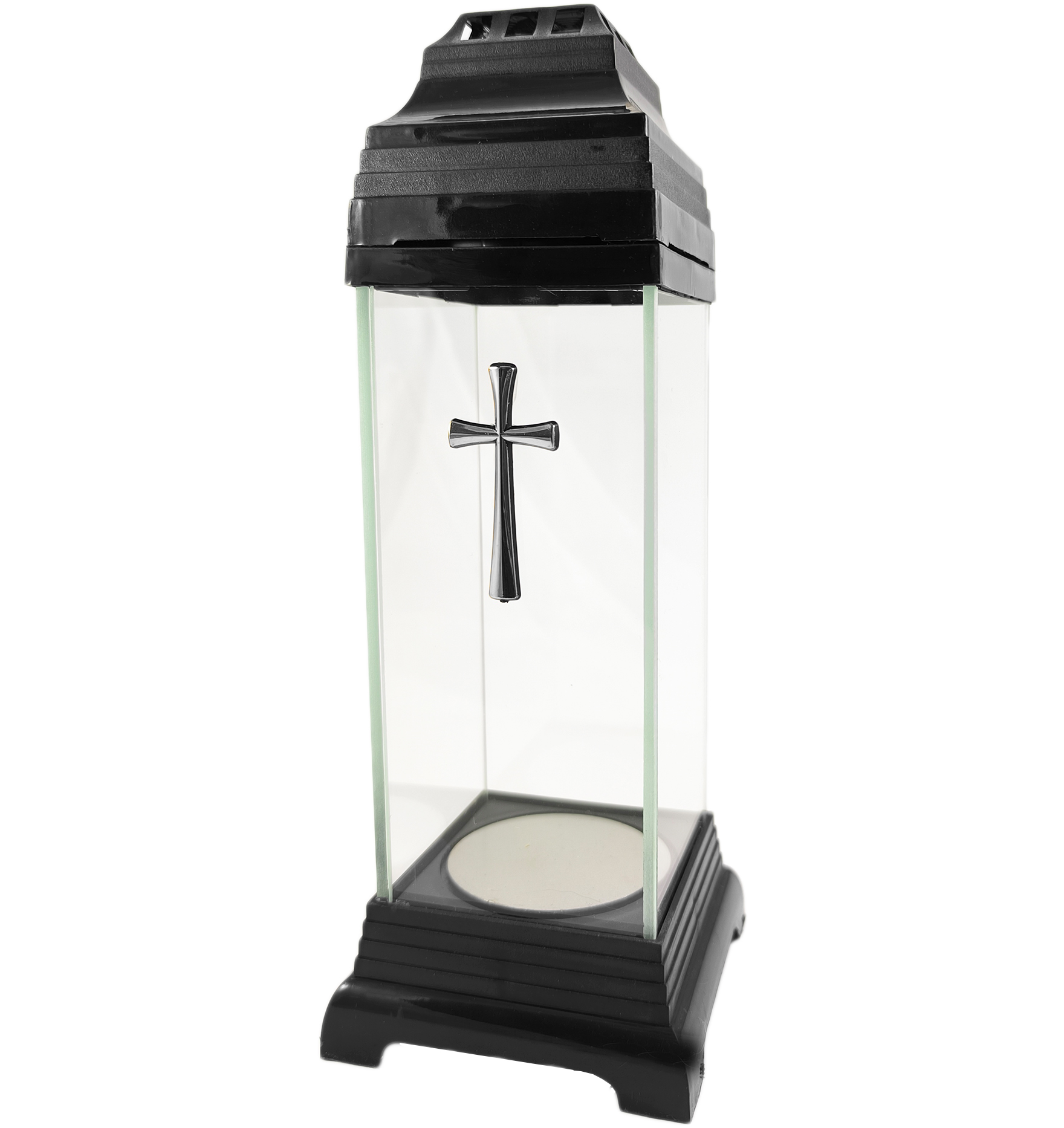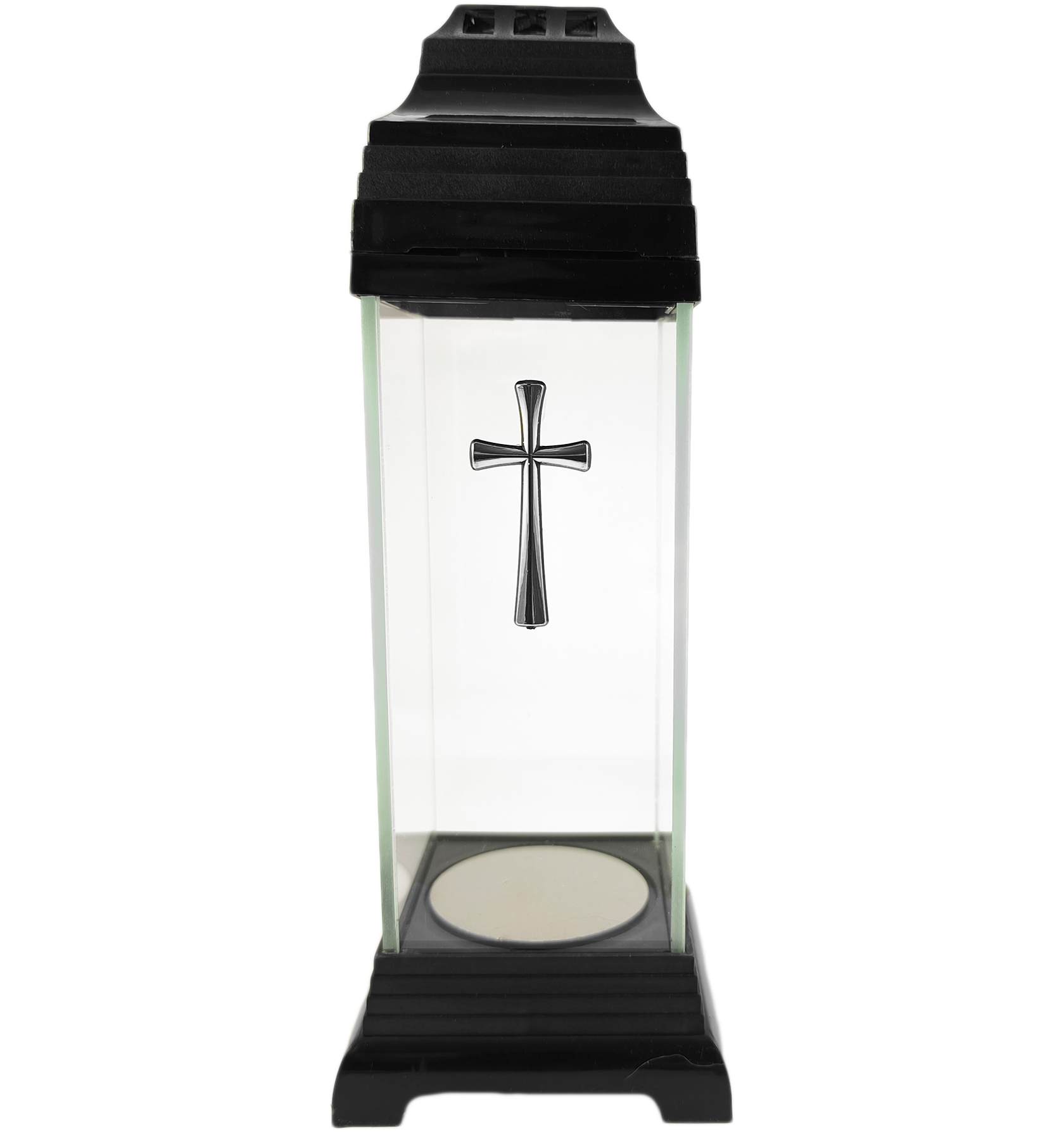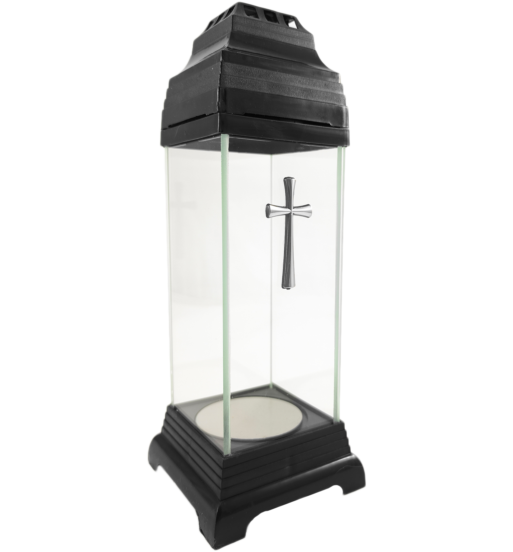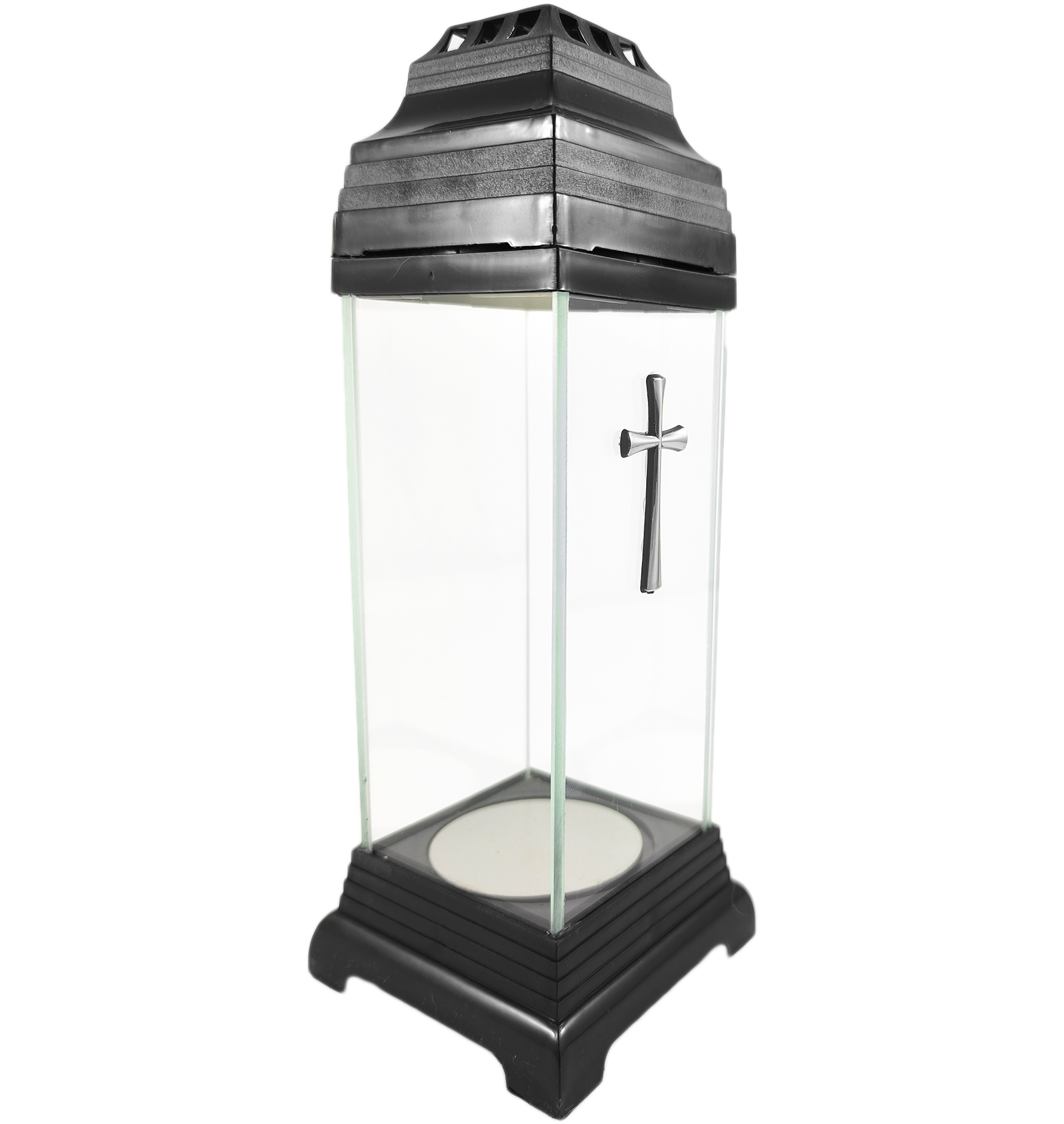 Kapliczka wykonana z bezbarwnego szkła z ozdobnym krzyżem w kolorze srebrnym. Znicz jest solidny, a dzięki niewielkim rozmiarom sprawdzi się idealnie jako dodatkowa dekoracja nagrobkowa. Zdobienia znicza są trwałe i odporne na warunki atmosferyczne.