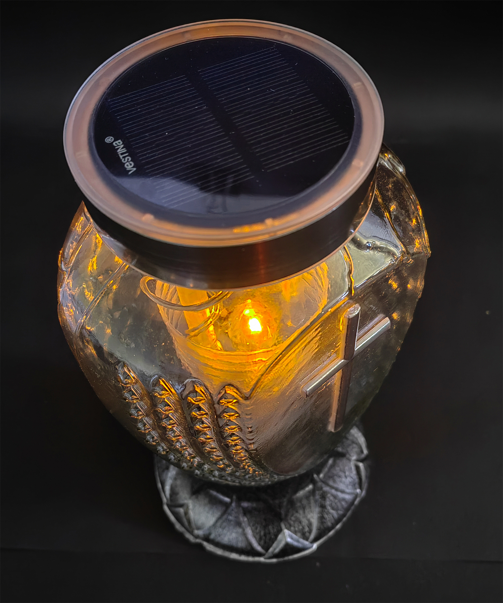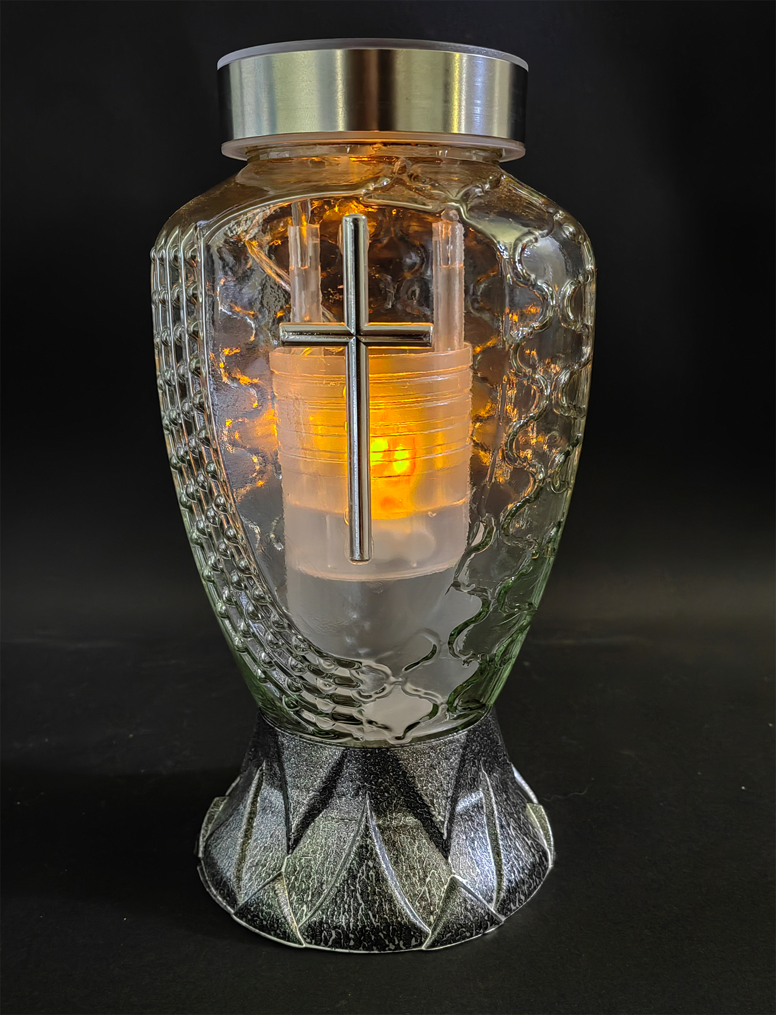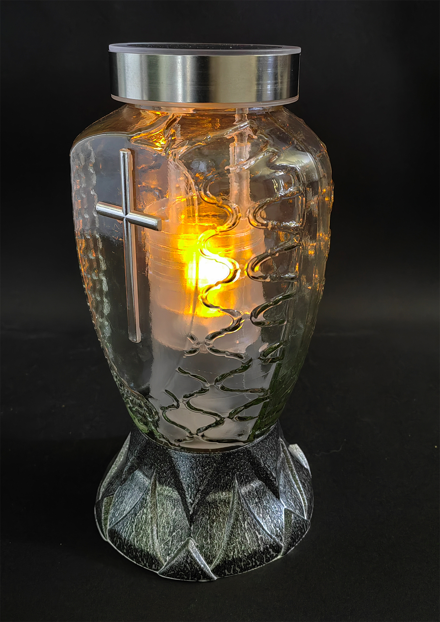 Lampion solarny żółty koralik z prostym, srebrnym krzyżem to idealny sposób na upamiętnienie bliskich. W górnym kapturku znicza został zamontowany duży panel solarny, który efektywnie ładuje akumulator zasilający „płomień”. Dioda znicza znajduje się na regulowanych prowadnicach, co umożliwia dostosowanie wysokości położenia światła. Znicz świeci przez całą dobę, również w trakcie dnia, zapewniając ciągłe oświetlenie. Klosz znicza wykonany jest z grubego szkła o unikalnej, nieregularnej fakturze, przypominającej mróz lub spękany lód, co nadaje mu wyjątkowego charakteru i pięknie rozprasza światło.