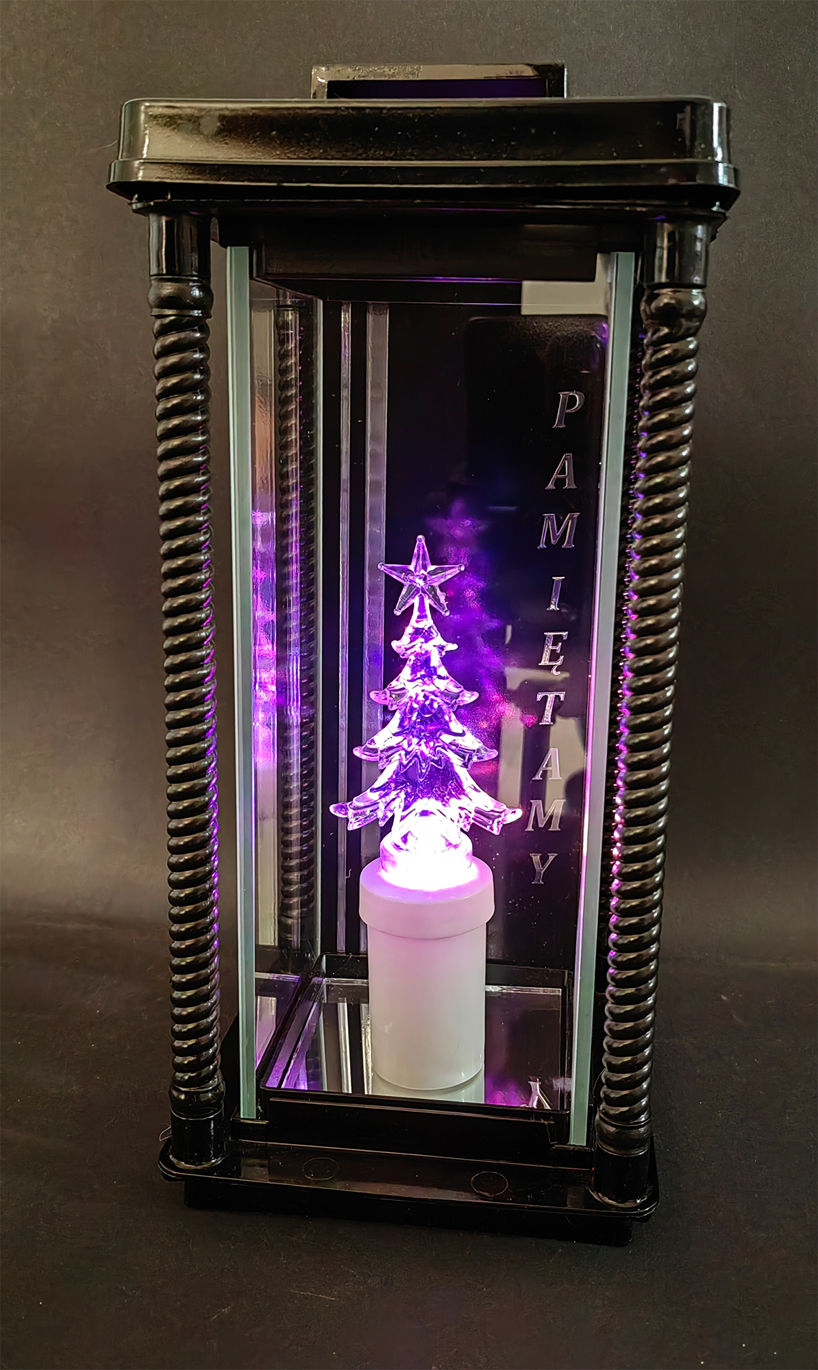 Kapliczka wykonana z grubego i bezbarwnego szkła. Na rogach zamontowane są cztery czarne kolumienki.  Znicz jest ciężki, solidny, a szeroka podstawa zapewnia stabilność. Tylna ściana została ozdobiona od wewnątrz srebrnym napisem PAMIĘTAMY.