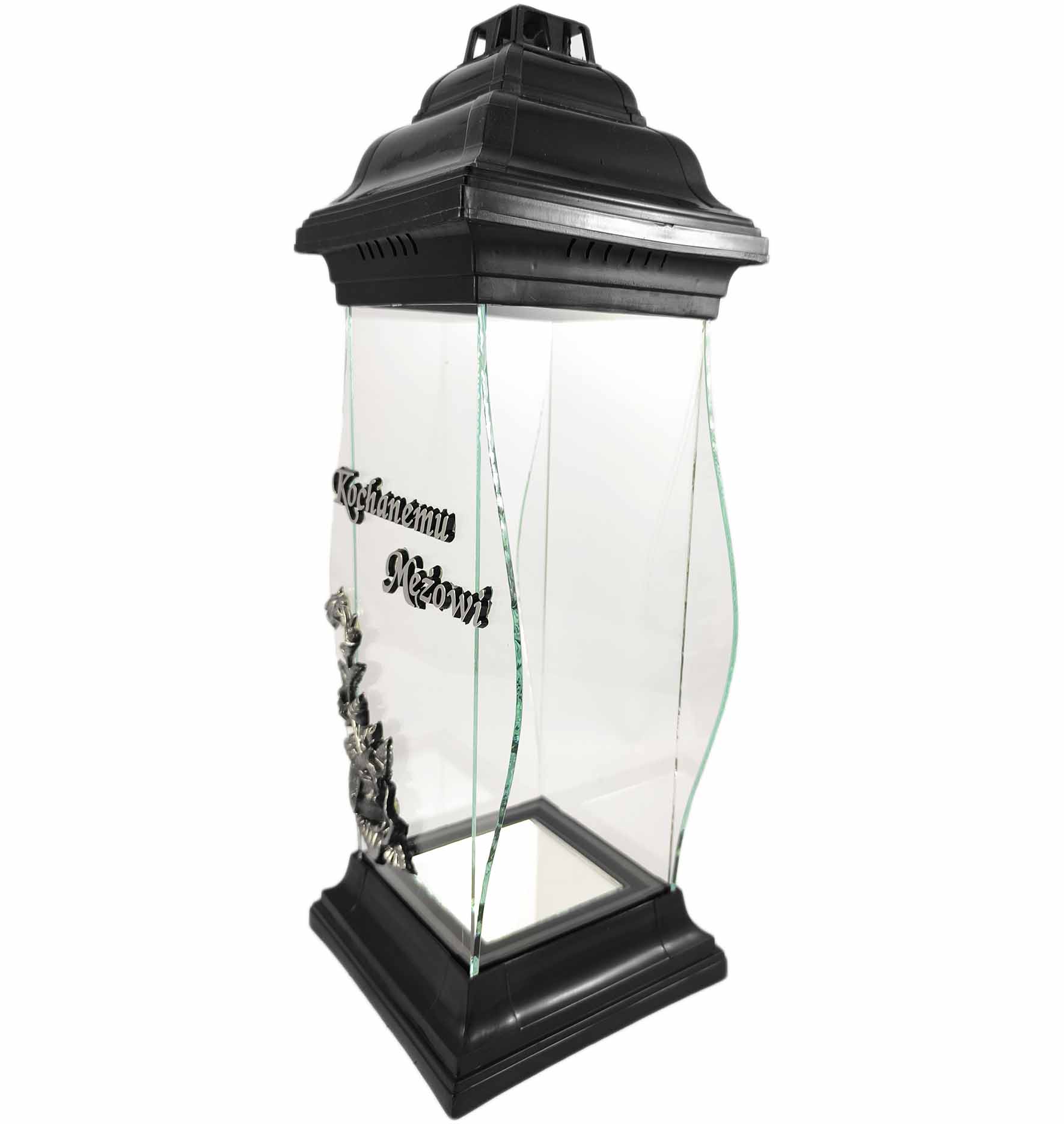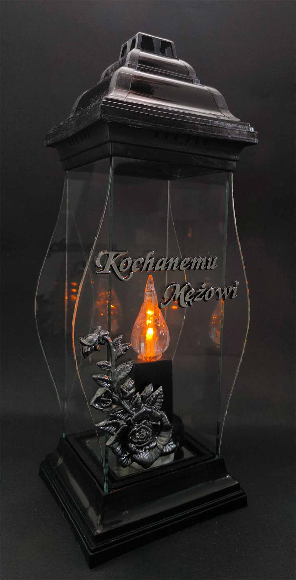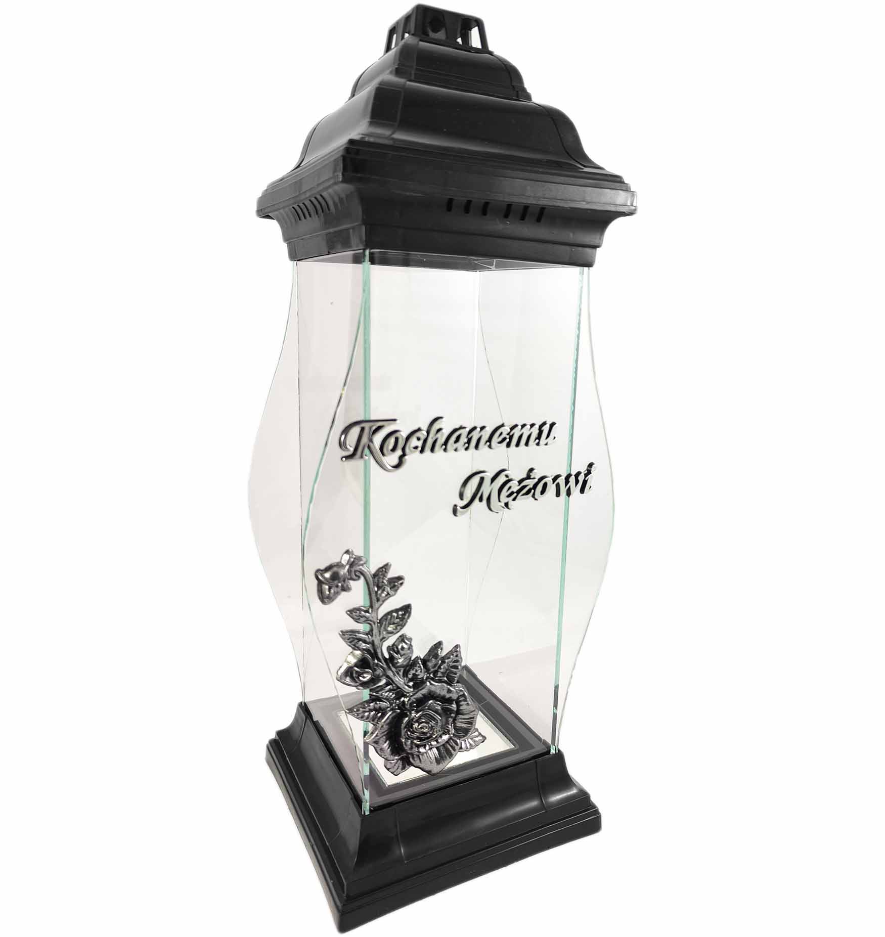 Pięknie wykonany znicz z bezbarwnego grubego szkła ze srebrnym napisem Kochanemu Mężowi. Smukły wysoki znicz dla Męża jest ciężki, solidny, a szeroka podstawa zapewnia stabilność. Elementy plastikowe wykonane są z twardego plastiku odpornego na wysokie temperatury.