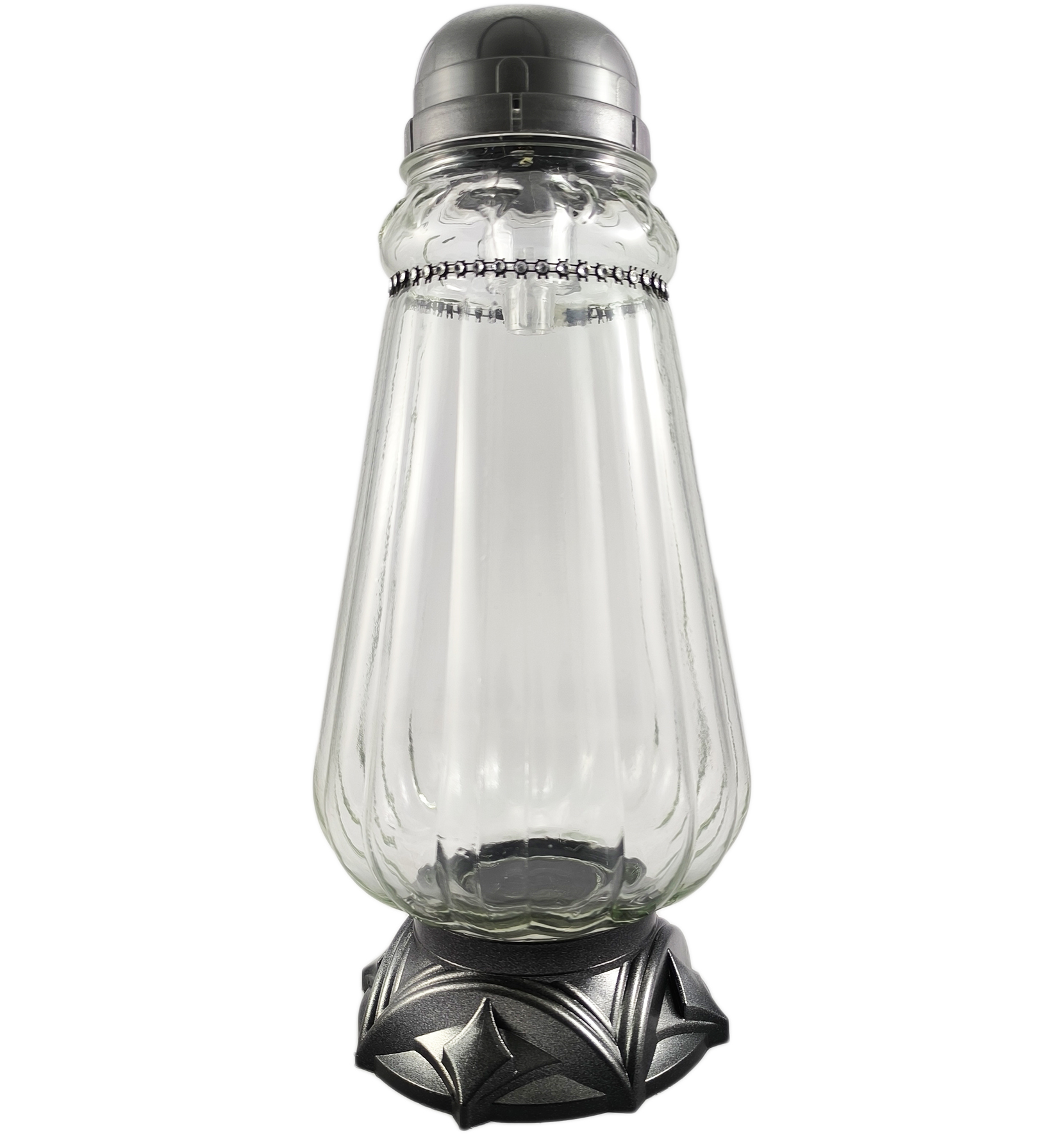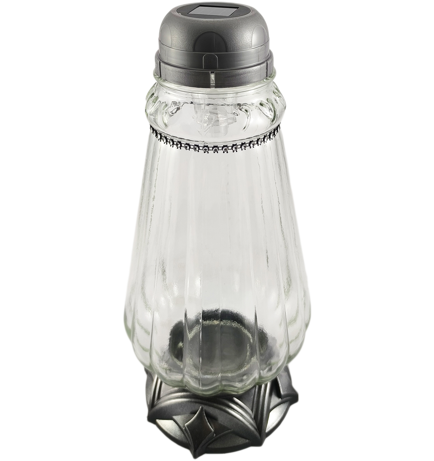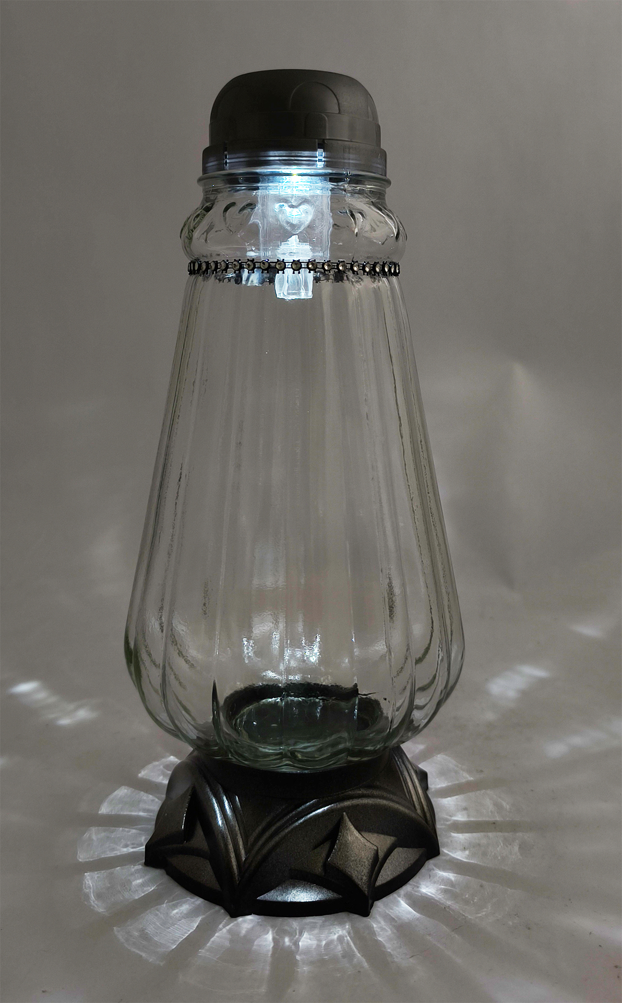 Pięknie wykonany wysoki lampion z solarem srebrny z oraz dodatkami w kolorze srebrno – czarnym. Wszystkie elementy doskonale do siebie pasują, są wykonane precyzyjnie i estetycznie. Wysokiej jakości szkło połączone ze stylowymi, złotymi elementami tworzy znicz o ponadczasowej elegancji. Jego kształt i zdobienia sprawiają, że stanowi piękną i godną ozdobę każdego nagrobka.