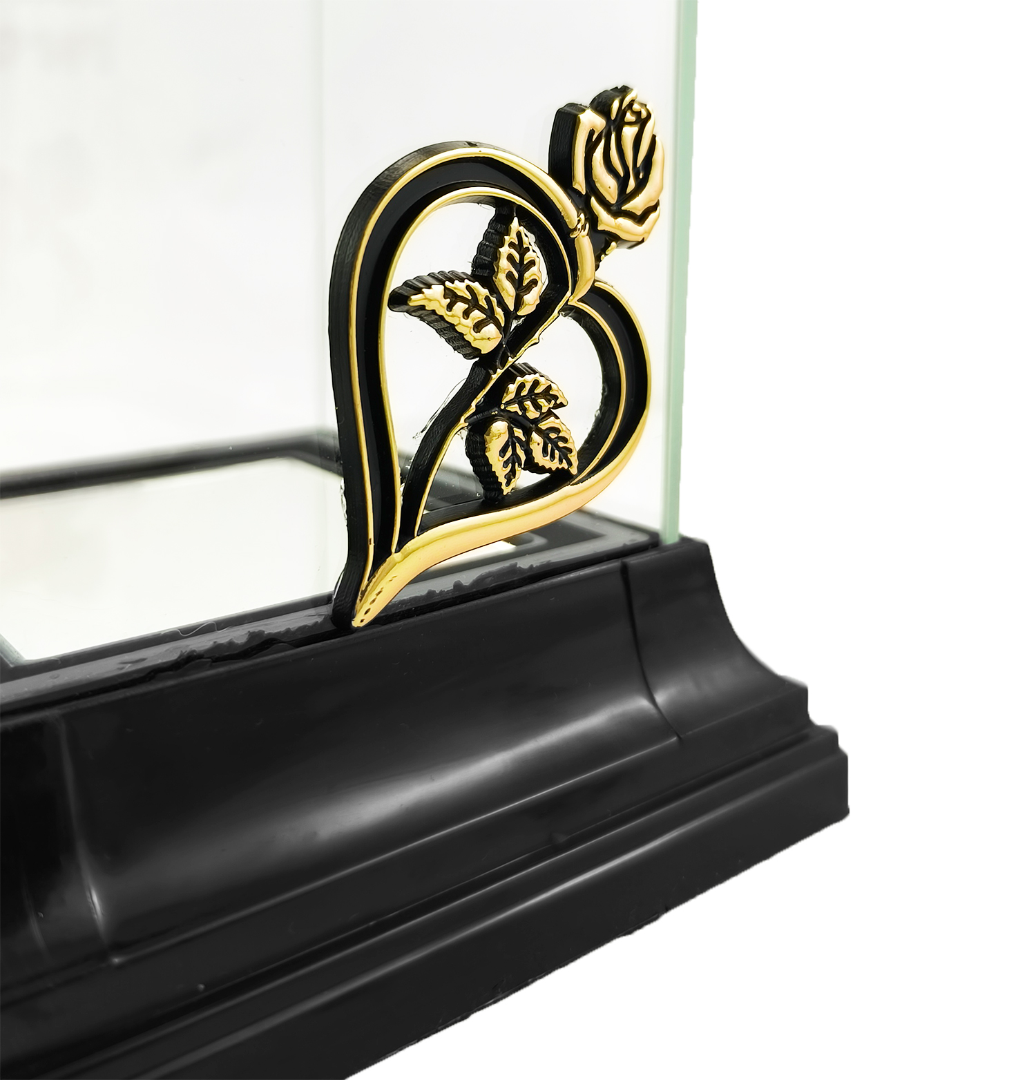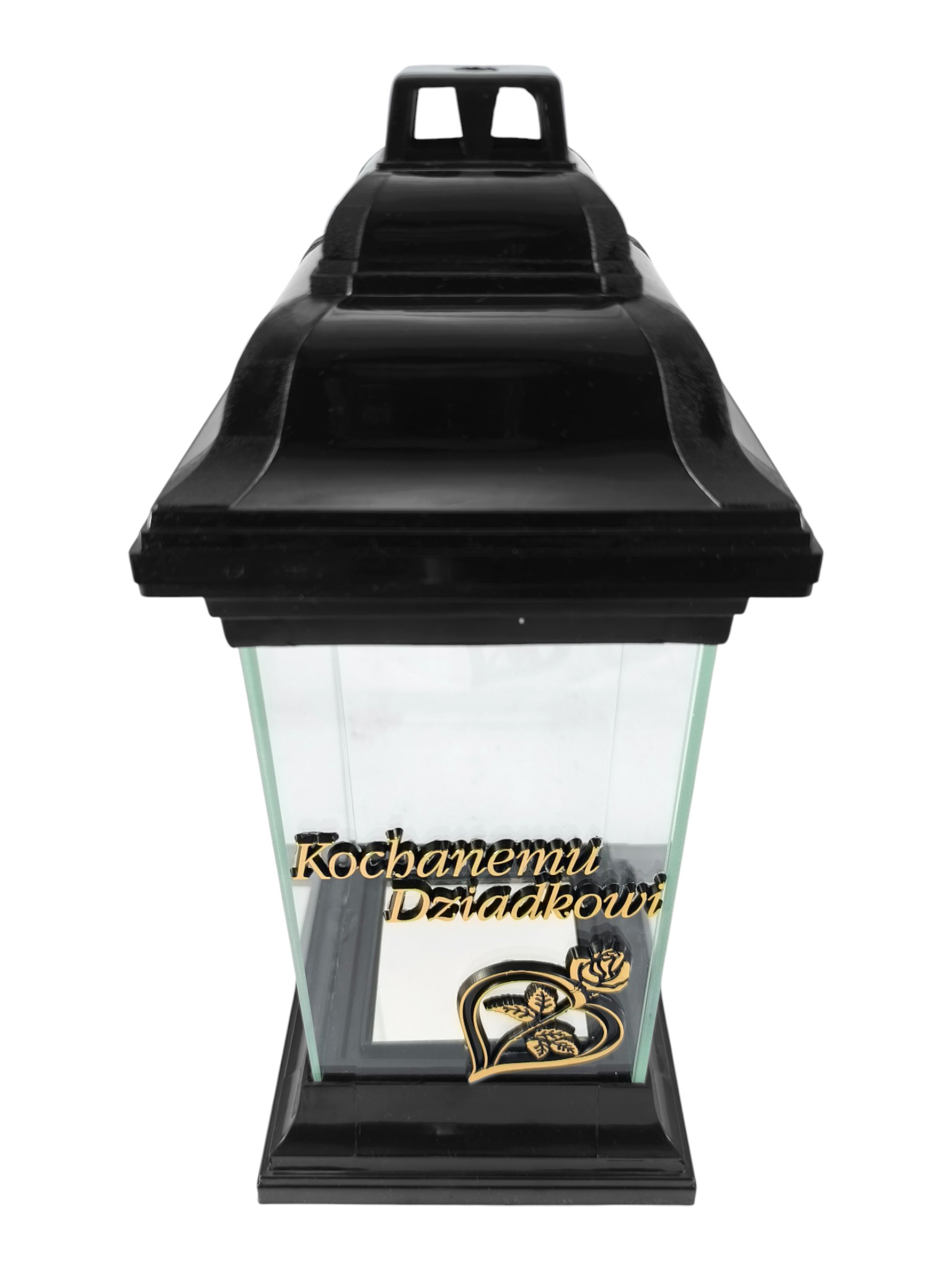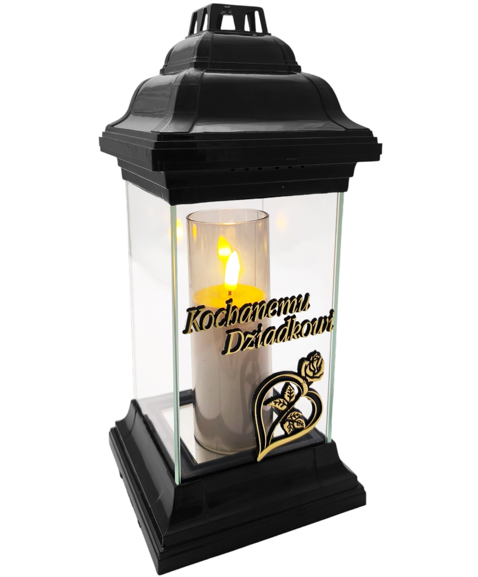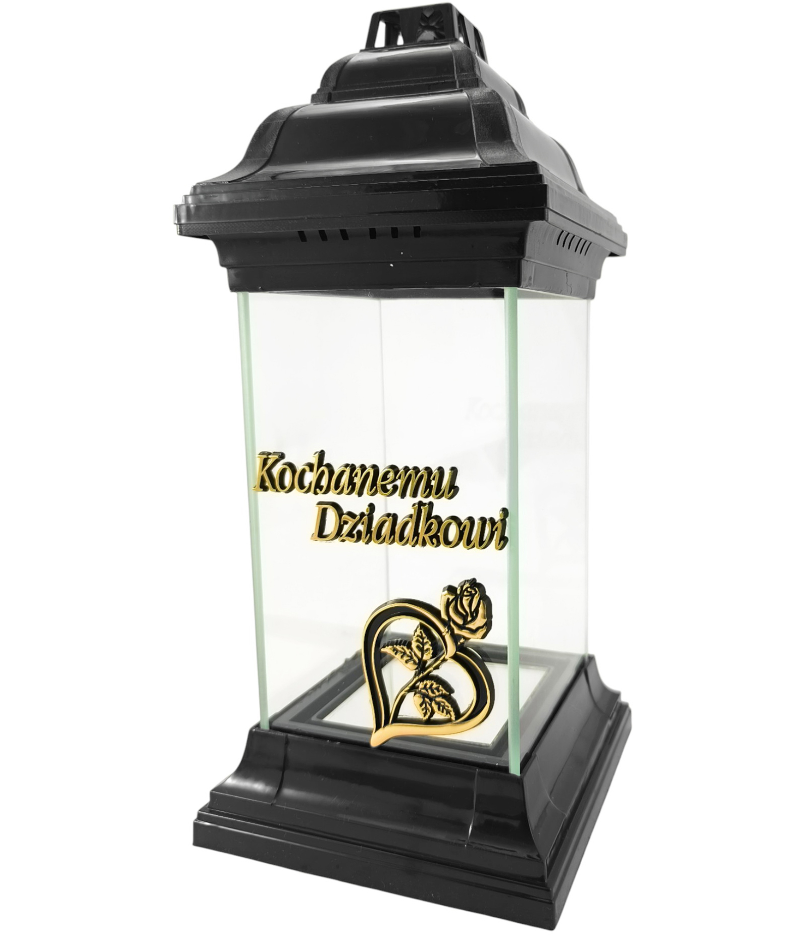 Przedstawiamy elegancki i masywny znicz w kształcie klasycznej kapliczki/latarni złote serce z różą i napisem „Kochanemu Dziadkowi” . Jest to uniwersalny model całoroczny, który dzięki swojemu ponadczasowemu designowi idealnie pasuje do każdego pomnika. Solidna, kwadratowa podstawa i kapturek wykonane z trwałego, czarnego tworzywa, w połączeniu z czterema szklanymi szybami, tworzą godny symbol pamięci.