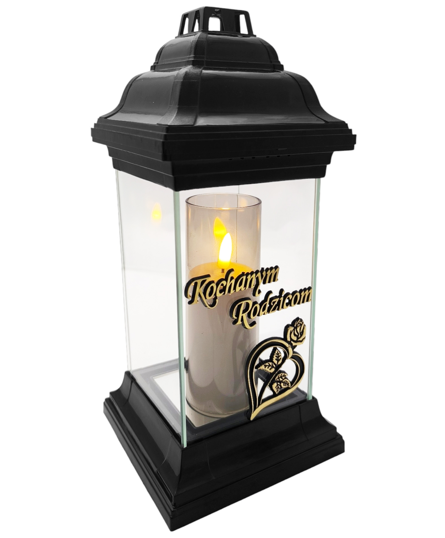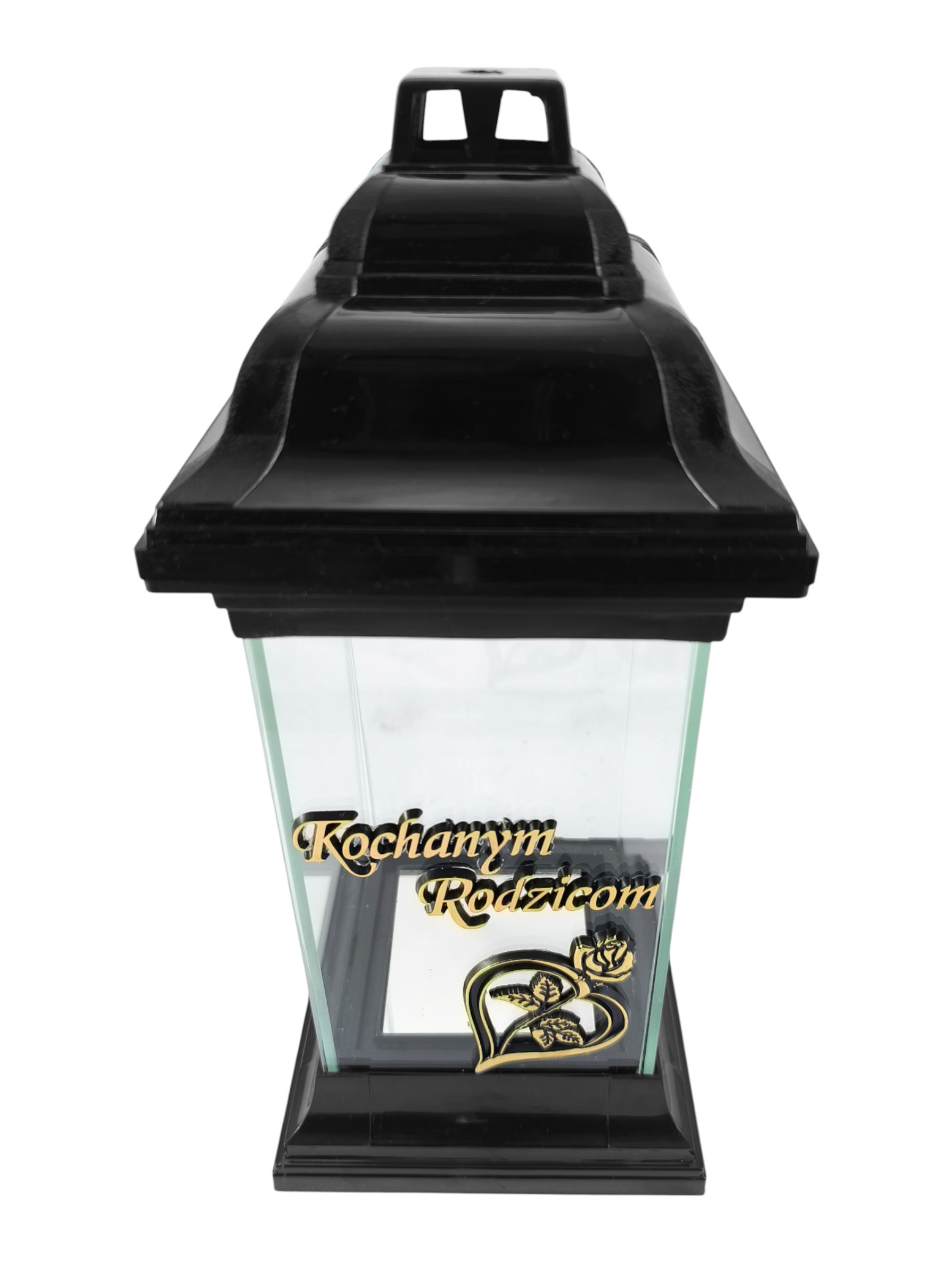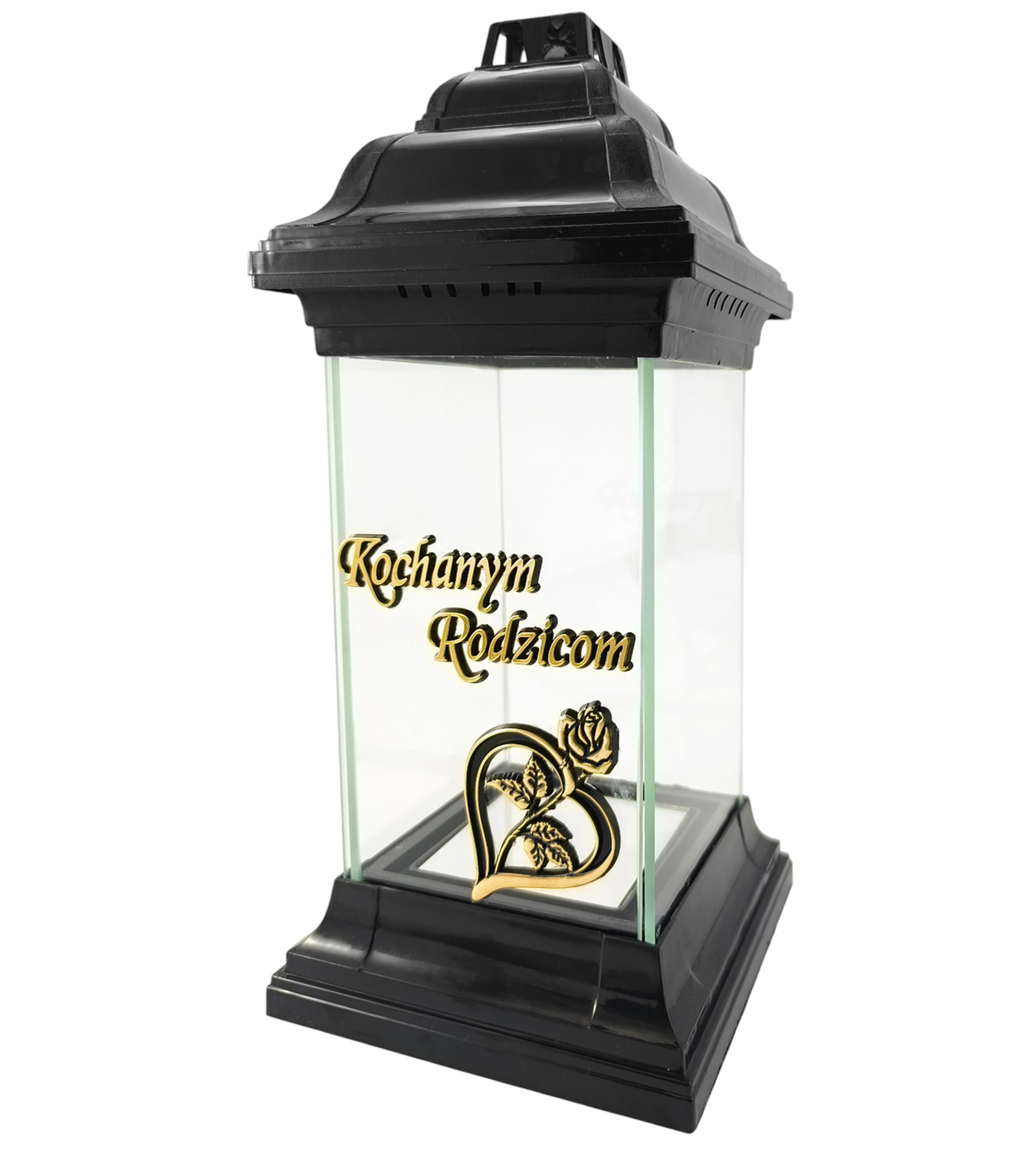 Przedstawiamy elegancki i masywny znicz w kształcie klasycznej kapliczki/latarni złote serce z różą i napisem „Kochanym Rodzicom” . Jest to uniwersalny model całoroczny, który dzięki swojemu ponadczasowemu designowi idealnie pasuje do każdego pomnika. Solidna, kwadratowa podstawa i kapturek wykonane z trwałego, czarnego tworzywa, w połączeniu z czterema szklanymi szybami, tworzą godny symbol pamięci.