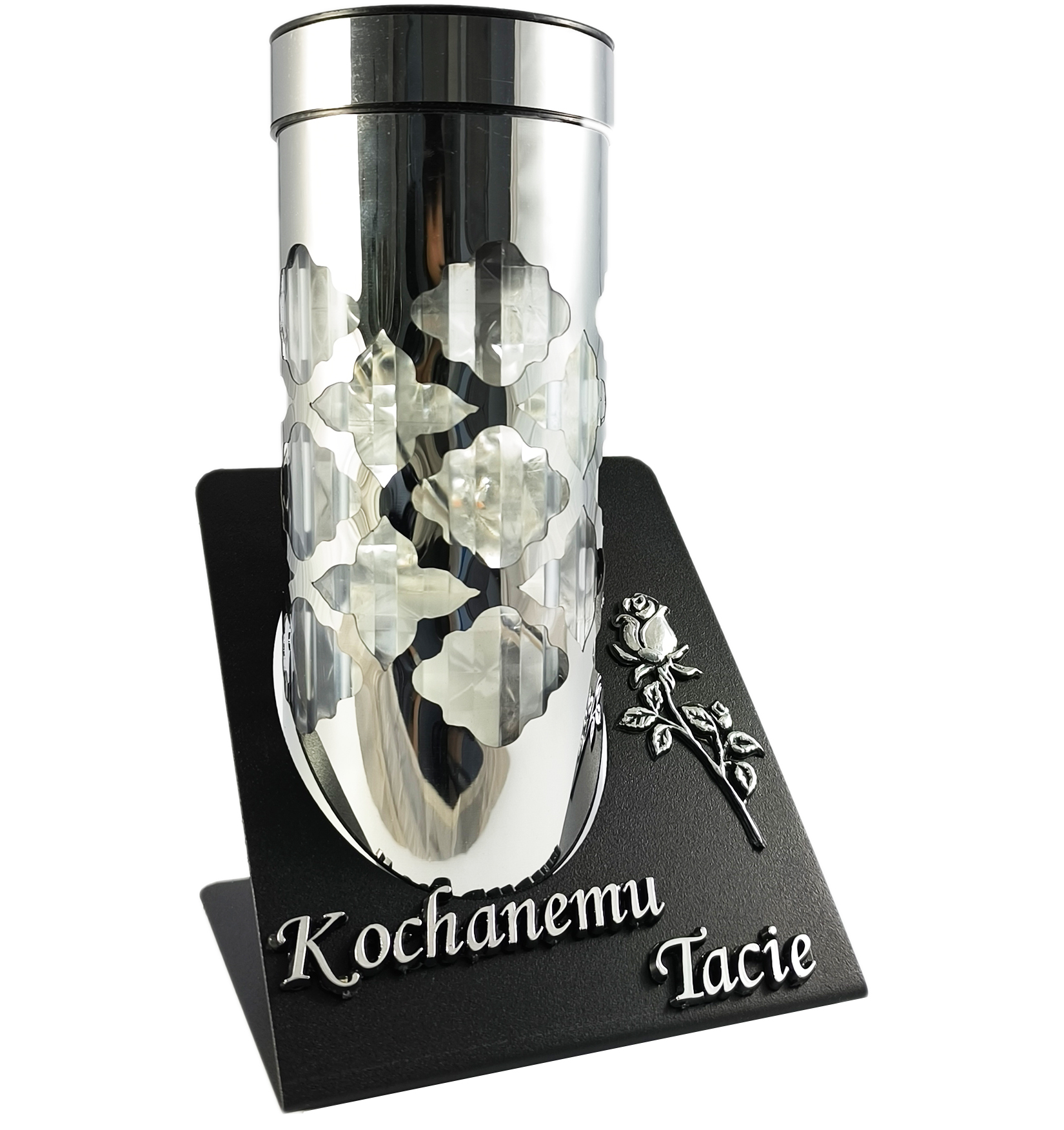 Na lampionie został umieszczony napis Kochanemu Tacie oraz róża w kolorze srebrnym.