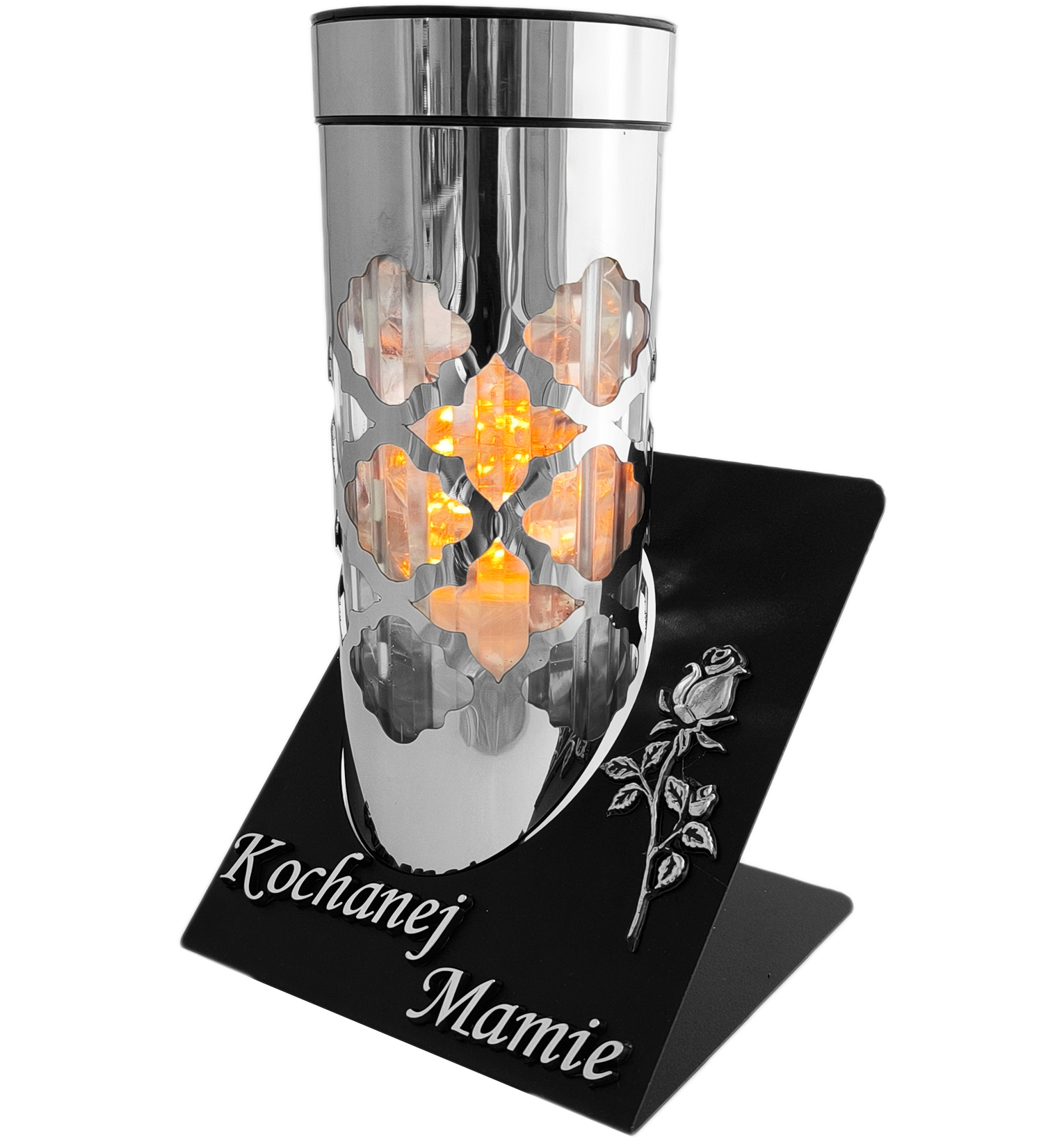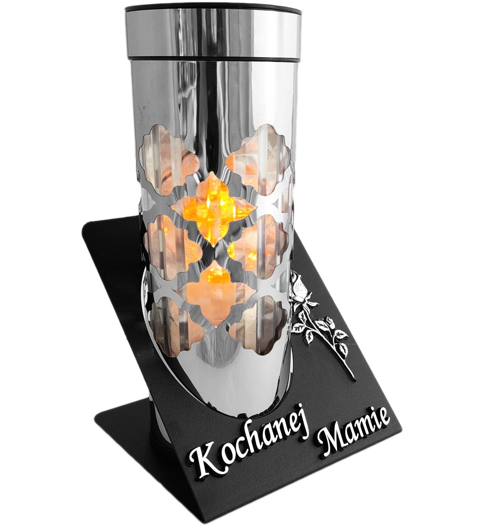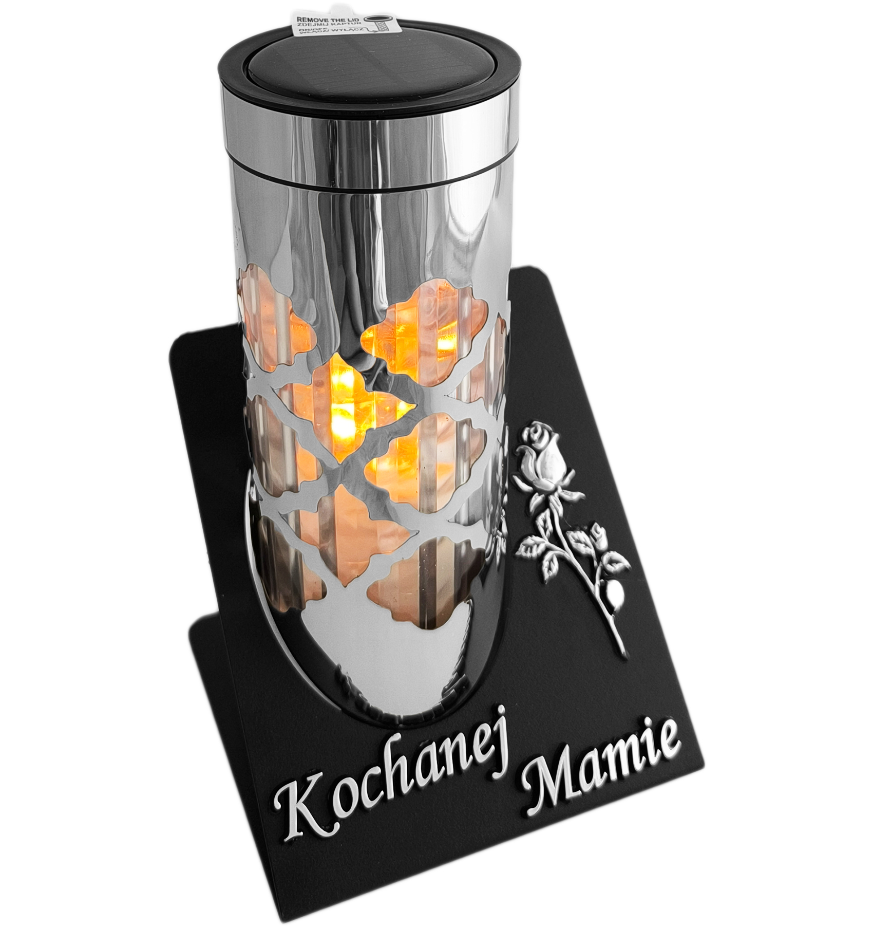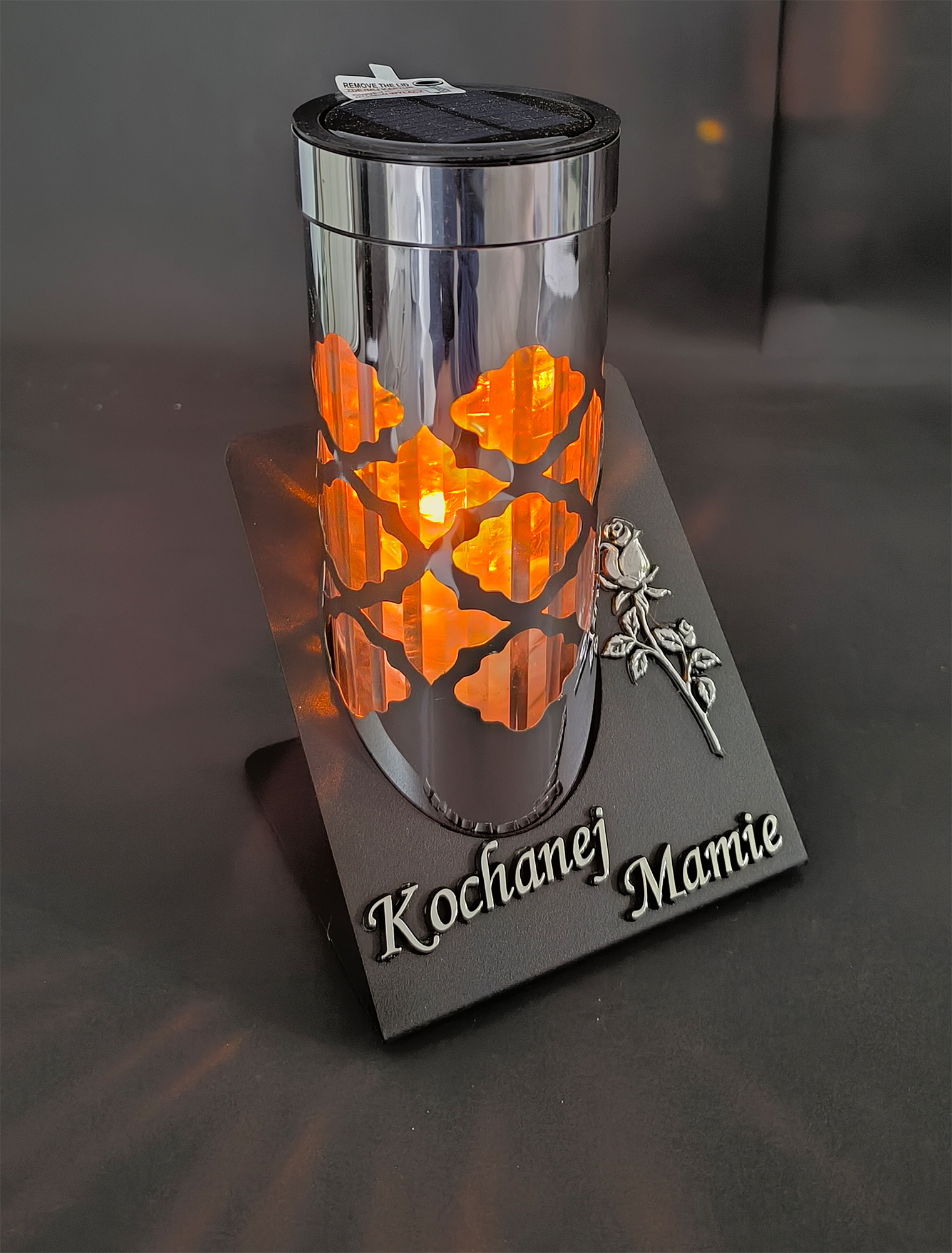 Nowoczesny znicz solarny ze stali z efektem płomienia z dedykacją dla Mamy