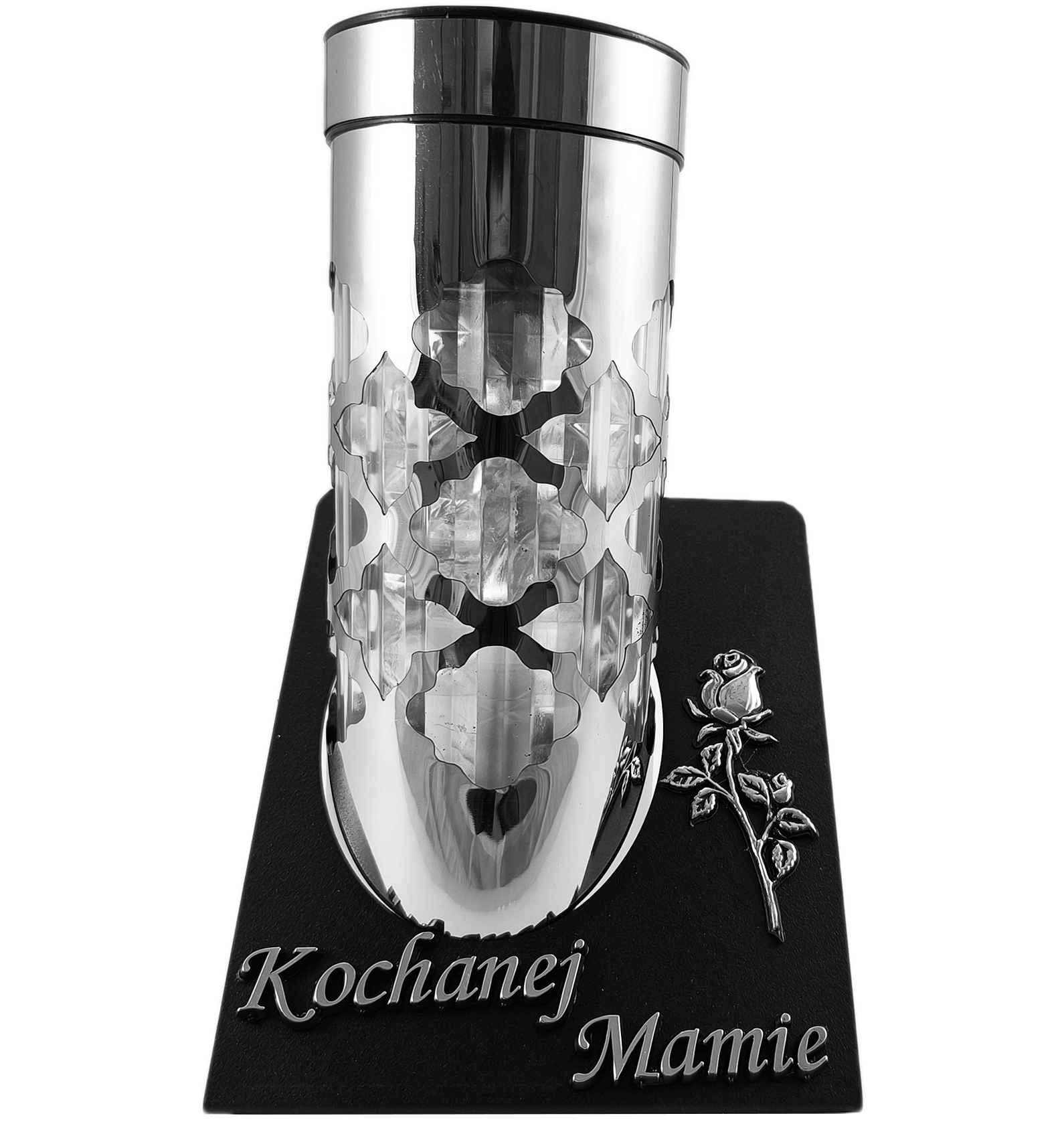 Wspaniały, nowoczesny znicz solarny wykonany z metalu. Podstawa lakierowana na czarno, ażurowa tuba ze stali chromowanej w kolorze srebrnym. Wewnątrz znajduje się karbowana tuba wykonana z bezbarwnego tworzywa, która rozprasza światło dając niepowtarzalny efekt. Na górze znajduje się panel solarny zasilający diody led imitujące naturalny kolor świecy.