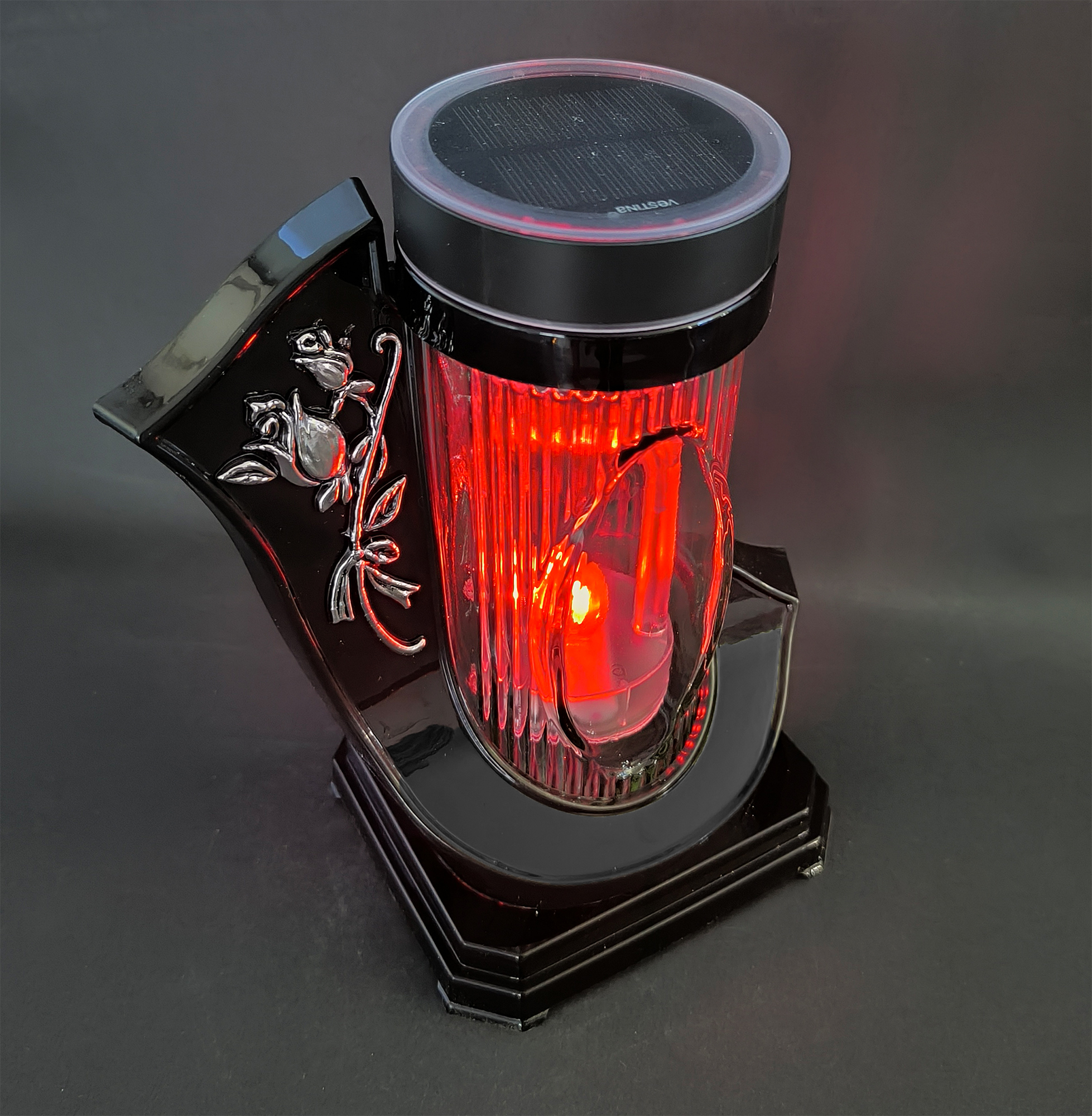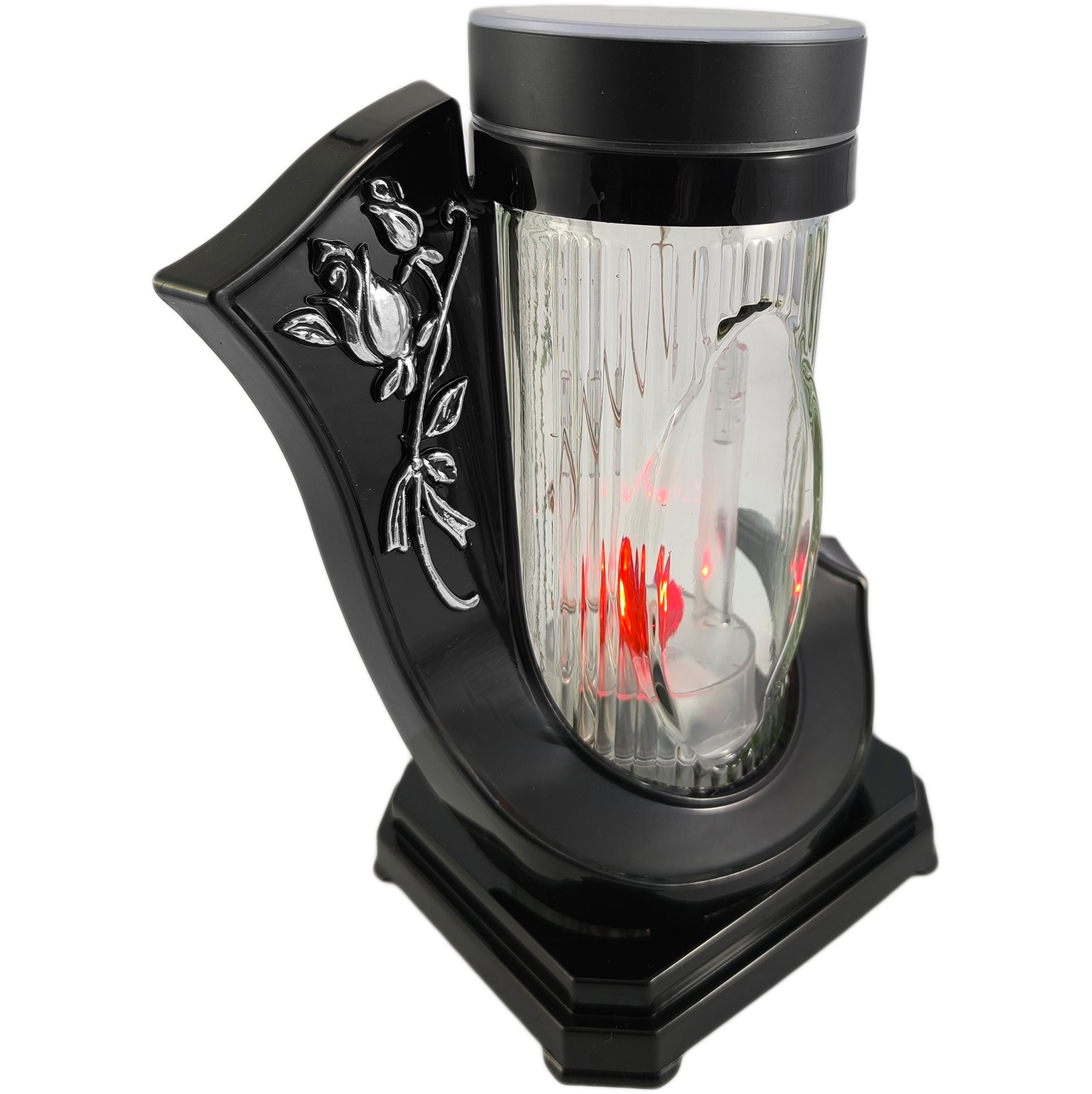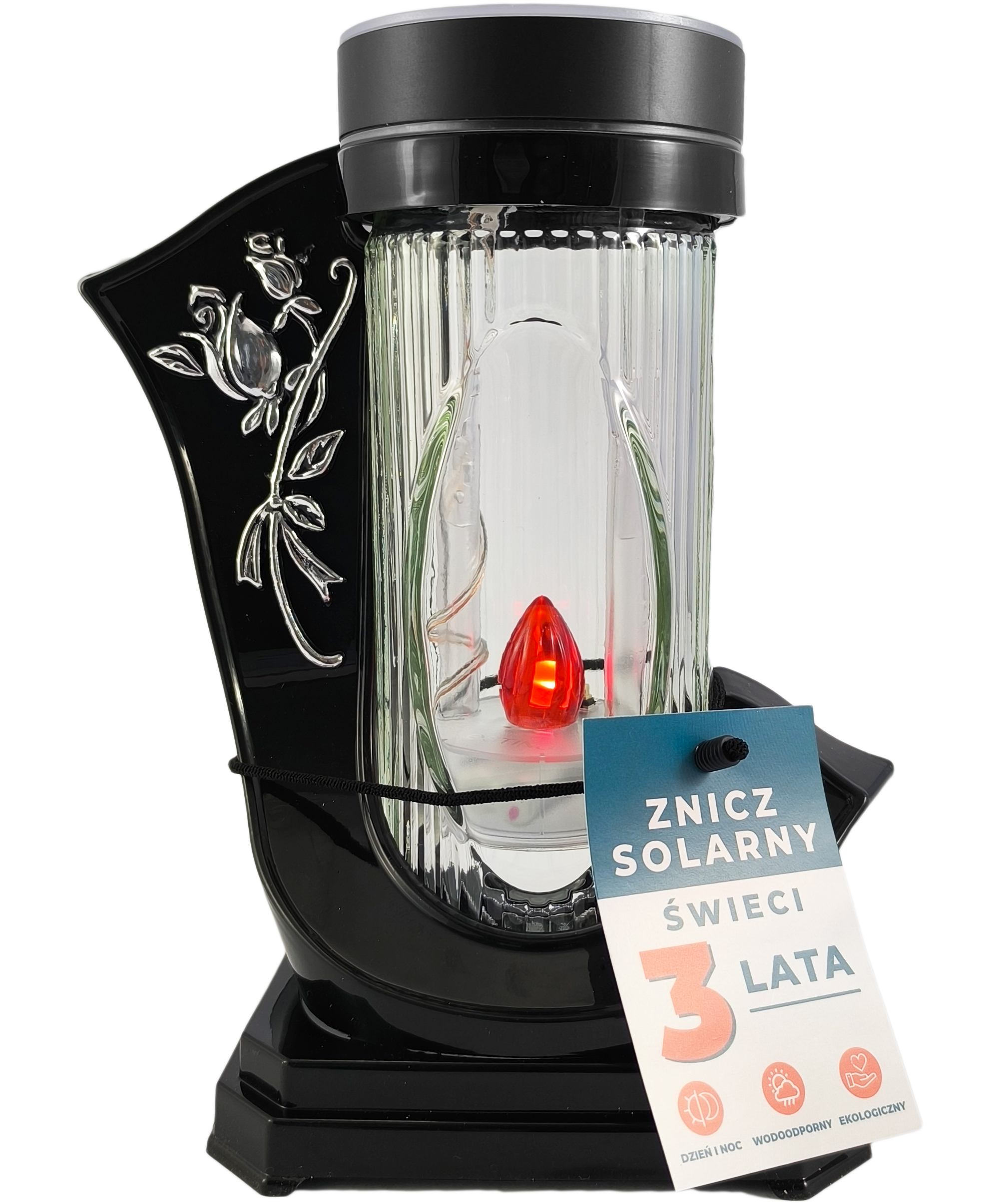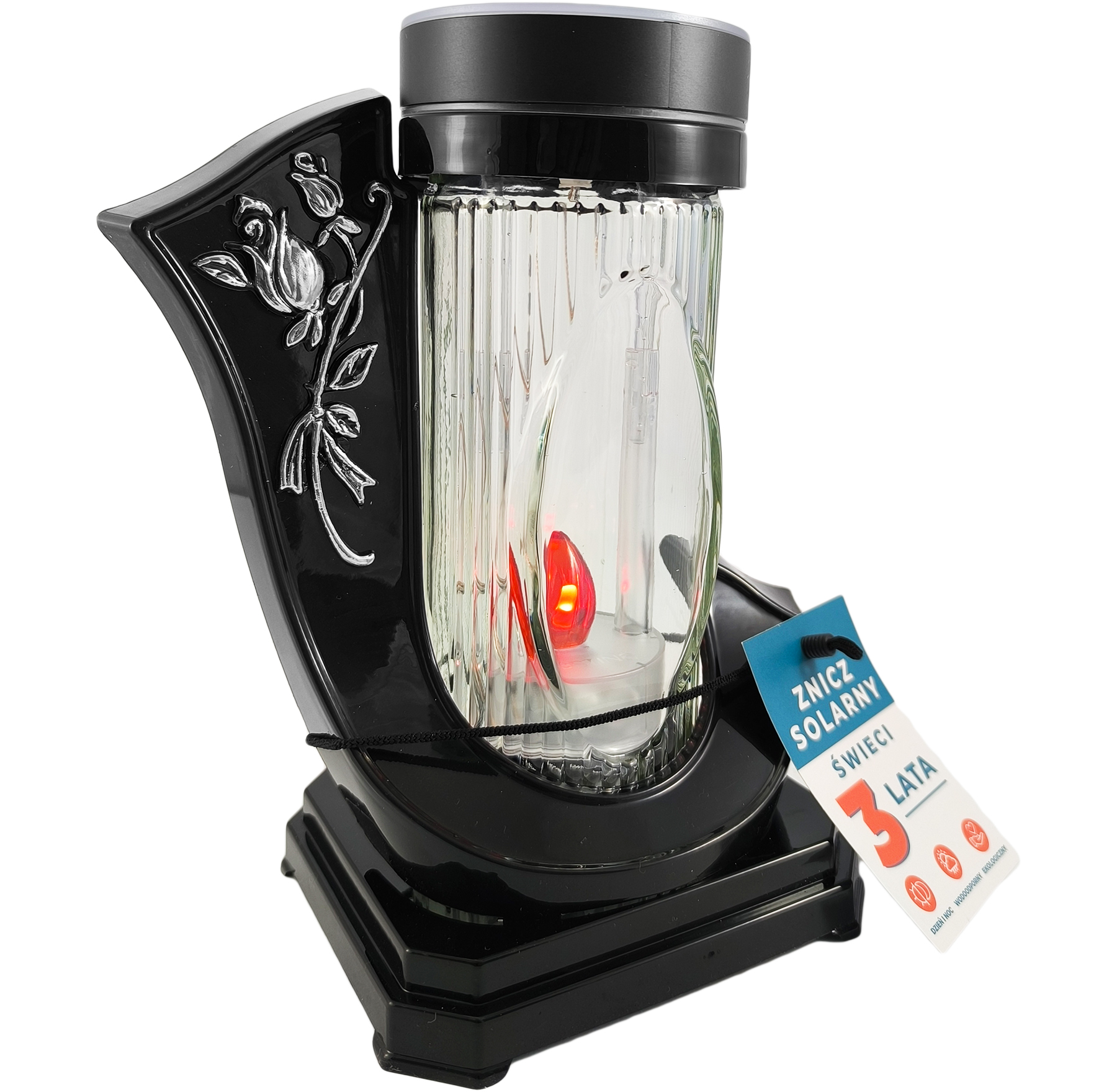 Wspaniały, nowoczesny znicz solarny Wstęga srebrny solarny wykonany z tworzywa. Znicz wykonany solidnie, a szeroka podstawa zapewnia stabilność Wewnątrz znajduje się szklana tuba, która rozprasza światło dając niepowtarzalny efekt. Na górze znajduje się panel solarny zasilający diody led imitujące naturalny kolor świecy. Czarna, solidna podstawa i ozdobny, złoty motyw róży na boku dodają mu elegancji i sprawiają, że pięknie prezentuje się na każdym nagrobku.