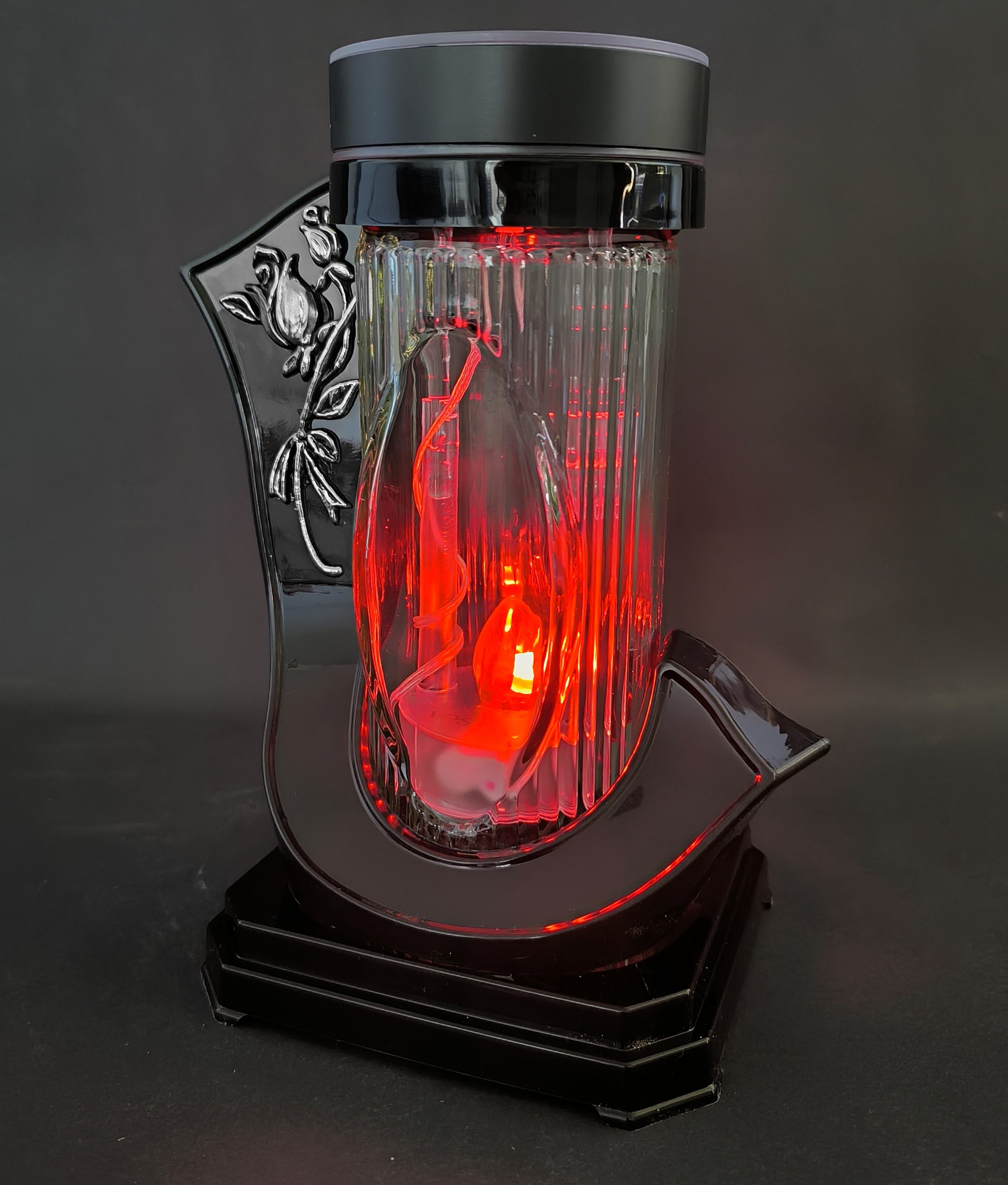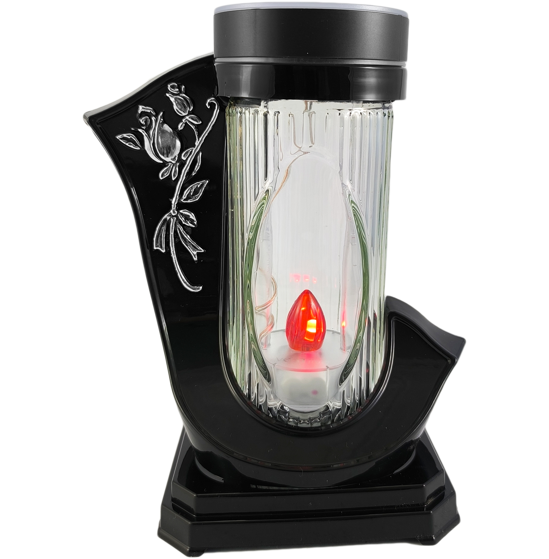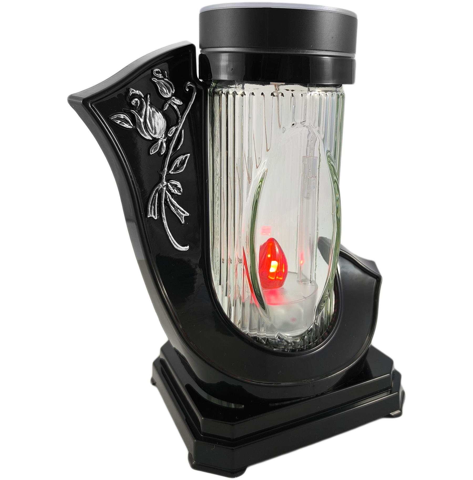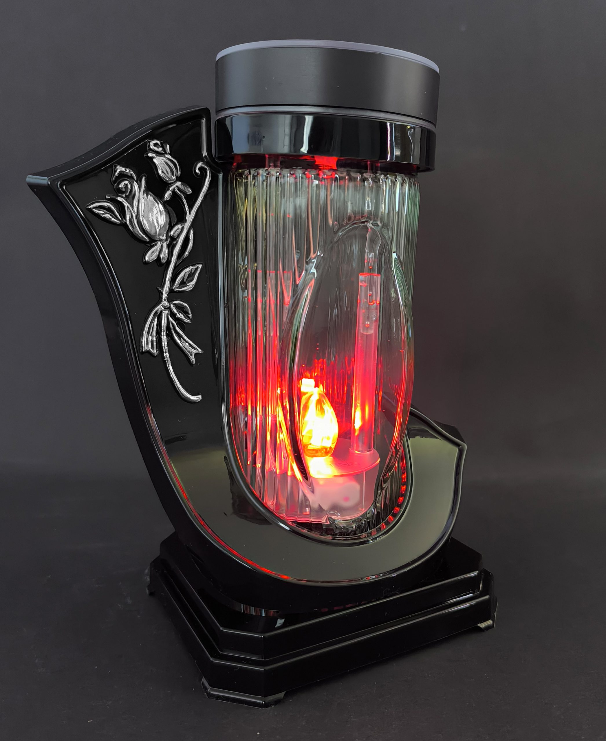 Wspaniały, nowoczesny znicz solarny Wstęga srebrny solarny wykonany z tworzywa. Znicz wykonany solidnie, a szeroka podstawa zapewnia stabilność Wewnątrz znajduje się szklana tuba, która rozprasza światło dając niepowtarzalny efekt. Na górze znajduje się panel solarny zasilający diody led imitujące naturalny kolor świecy. Czarna, solidna podstawa i ozdobny, złoty motyw róży na boku dodają mu elegancji i sprawiają, że pięknie prezentuje się na każdym nagrobku.