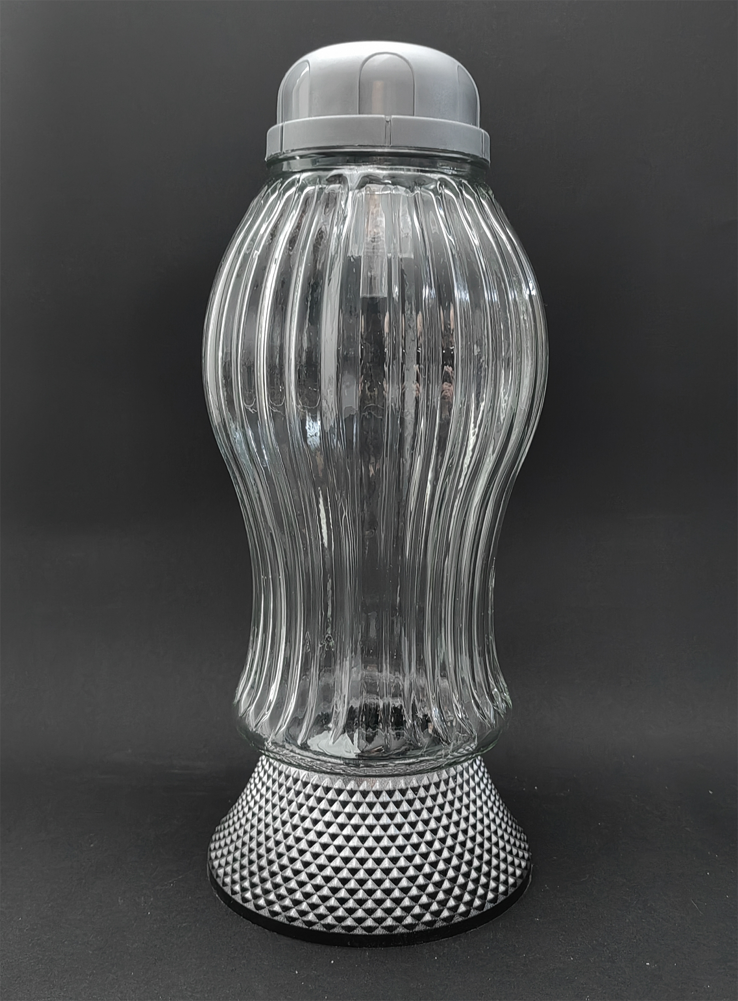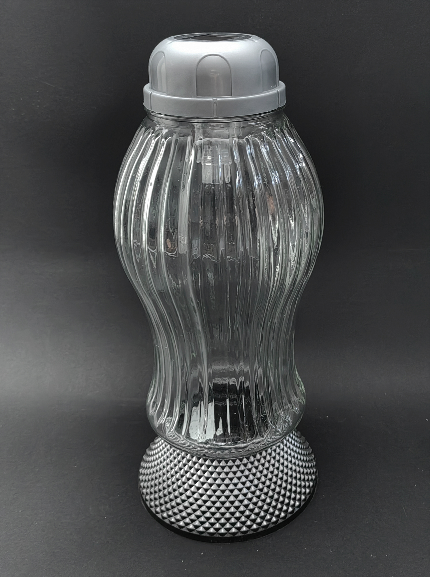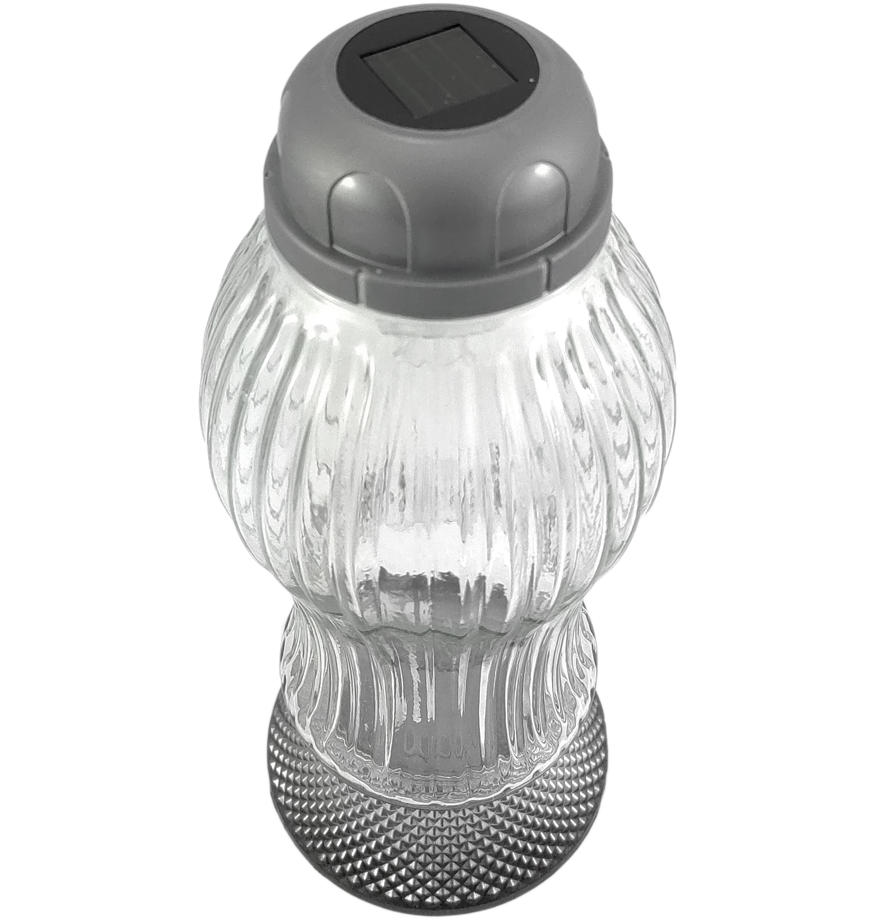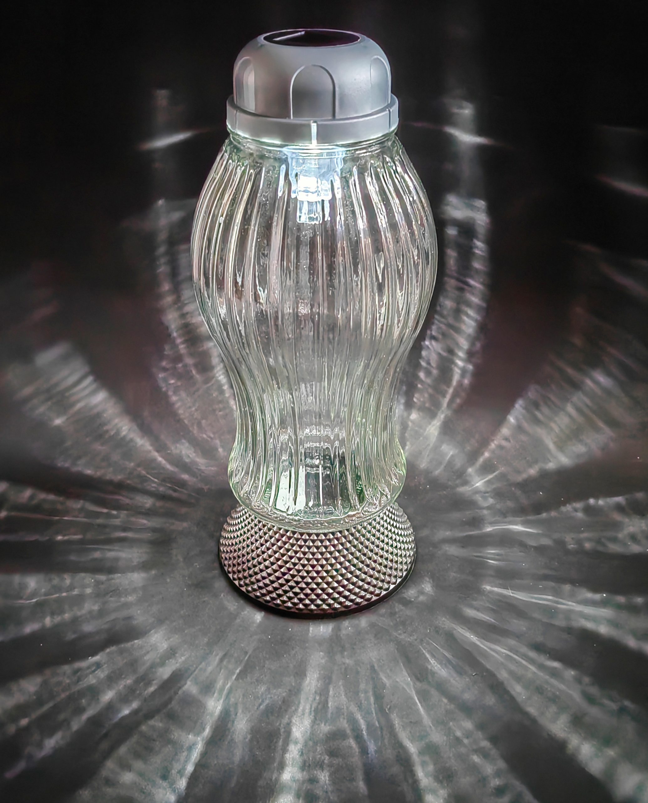 Pięknie wykonany znicz z panelem solarnym wysoki z dodatkami w kolorze srebrnym. Wszystkie elementy doskonale do siebie pasują, są wykonane precyzyjnie i estetycznie. Znicz charakteryzuje się unikalnym kształtem z falistą, pionową fakturą na górnej części szklanej obudowy, która pięknie rozprasza światło.
